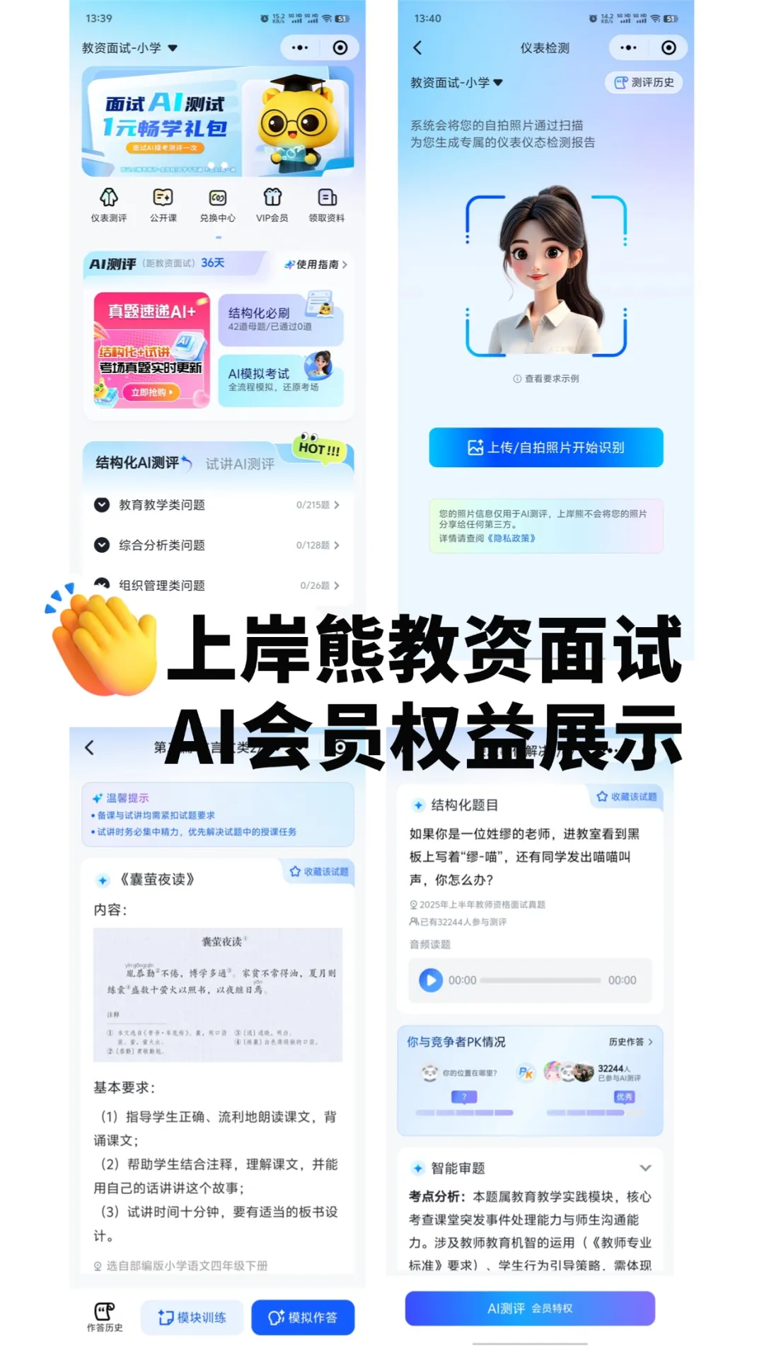 上岸熊教资AI面试3次权益免费送!!!原价29.9的权益,现在免费送!需要的+v(KYtang2),记得备注教资ai,仅限前50位!试讲课程:试讲理论课+模板技巧课+示范课+直播答疑