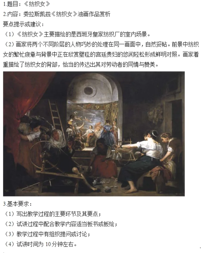 ②教师引导提问:画家只把这则故事画在了后面的背景中,那画面中主要描绘了什么呢?学生回答,教师总结:画面主要描绘了五个纺织女工在西班牙皇家纺织厂的各种劳动姿态。在这五个纺织女工当中,最突出的是画面近景右侧那个穿白衣的纺织女。