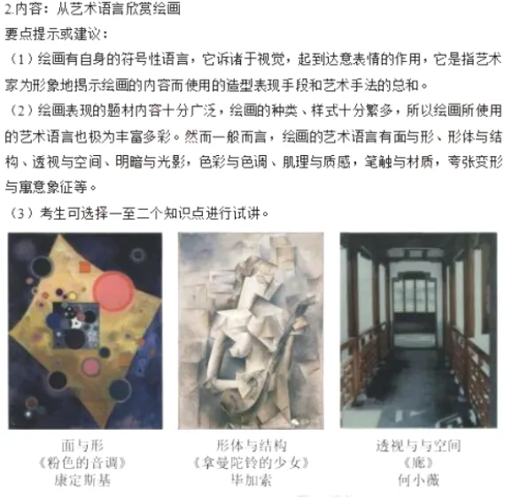 3.完成小组讨论后,学生回答问题,最后师生共同总结:《构图九,第626号》是康定斯基的作品,属于热抽象,作品用了两个相同的三角形,把画面的两端截开,散布着一些各色各样的小形体。