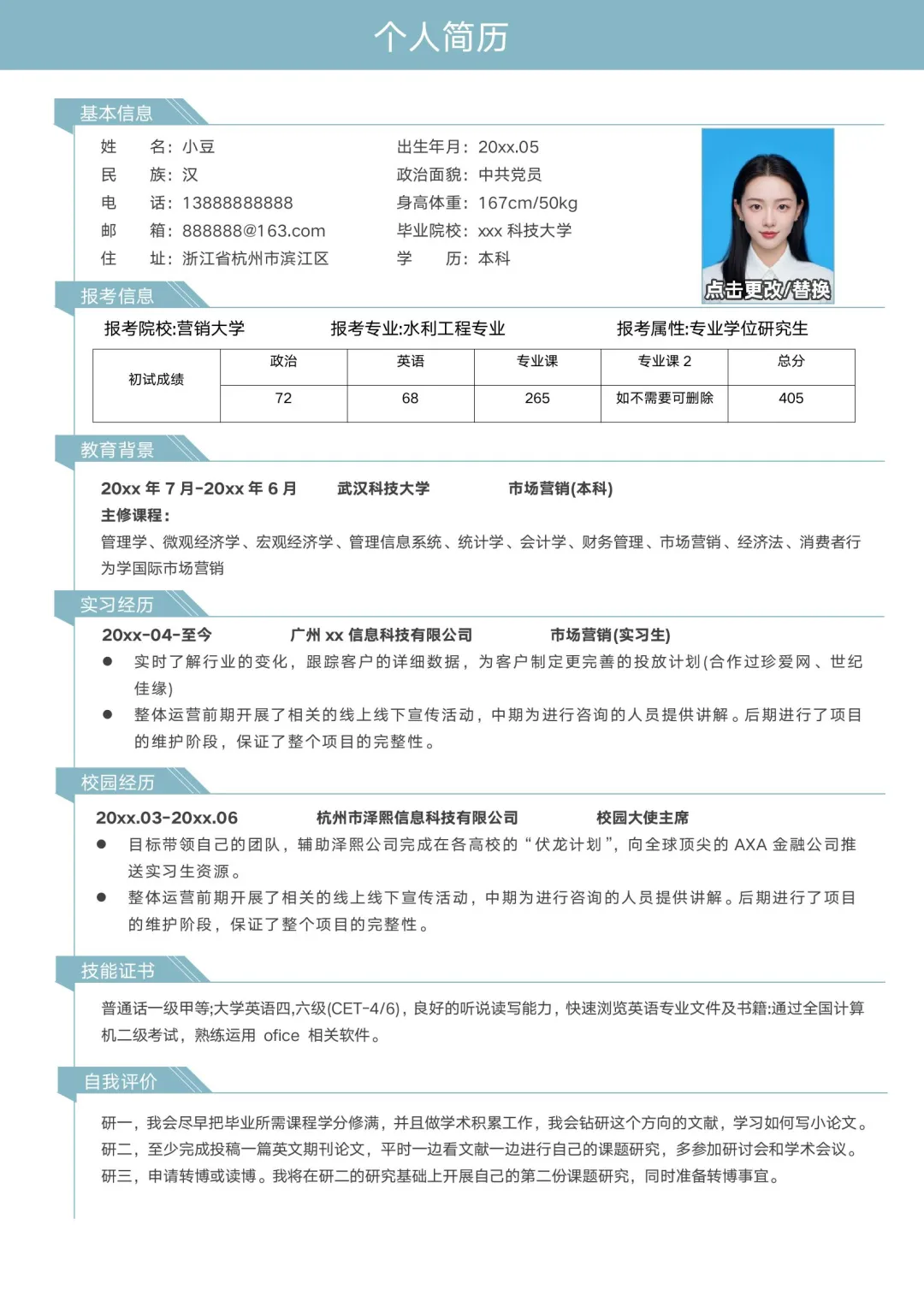 考研复试带份清爽吸睛简历,绝对让你的面试事半功倍。虽然很多学校并没有强制规定考研面试也要带简历,但你做了,效果绝对不同。你笔试成绩是死的,但人是活的,考研和高考不一样,老师会更多地考察试卷上看不出来的东西,越是好学校,越是大拿导师,越是这个倾向。好好准备考试,按我这一套模板选一个填进你的优势,让导师眼前一亮,直接在心里把你锁定,都整理好了,不要再去翻了,停,保存,下载,行动。链接自取: