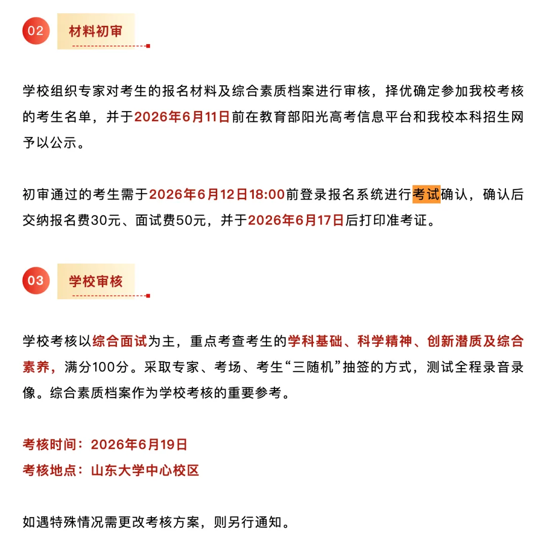 根据山东大学本科招生网 4 月 24 日发布的《2026 年山东省综合评价招生简章》:
