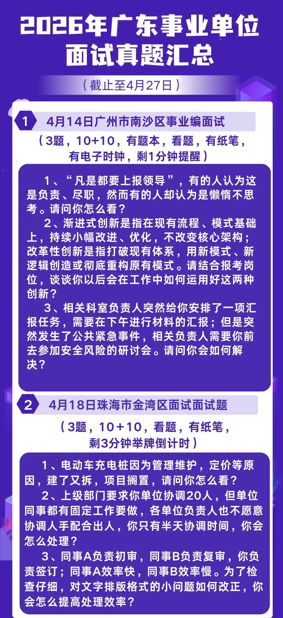 随着4月下旬面试密集进行,2026广东事业编面试面试呈现出明显的“实务化”与“本土化”特征。本期专题汇总了4月28日前广东各地市面试真题。速看收藏,上岸快人一步!