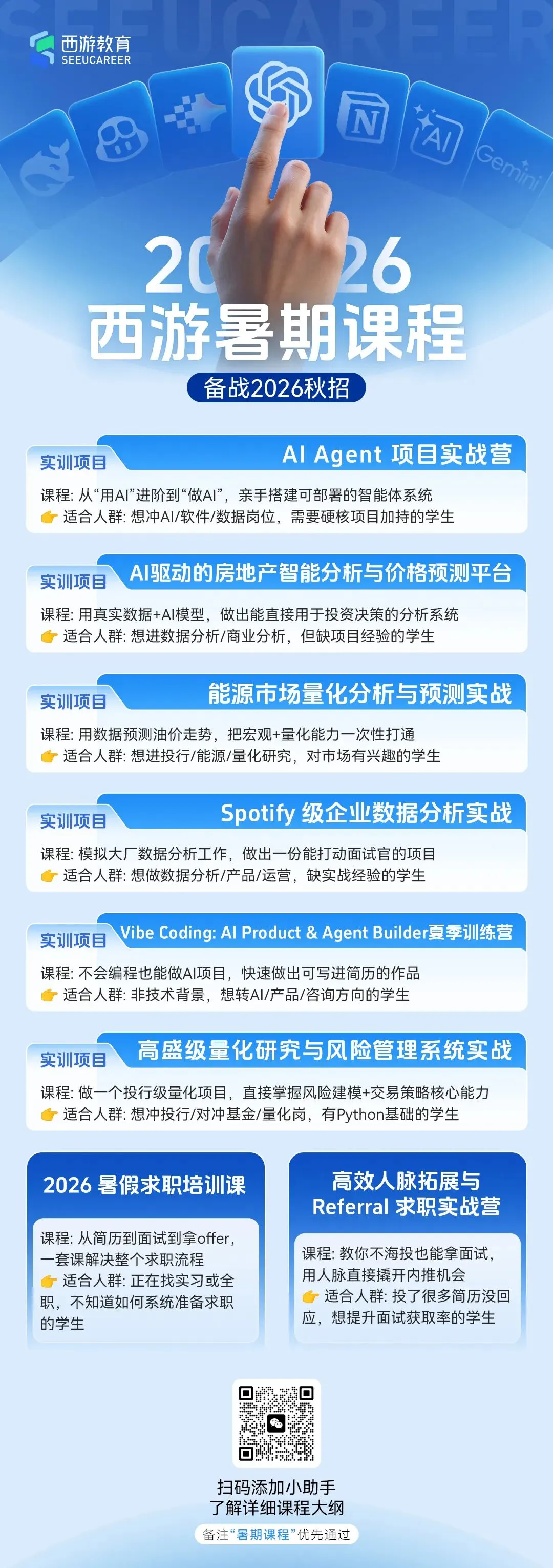西游现在可以开始报名以下留学生项目型暑假课程,导师都是来自美国名企,感兴趣的留学生家长可以扫码咨询,限量招生,先抢先得👇