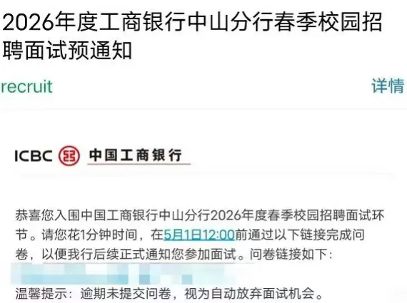 恭喜您入围中国工商银行中山分行2026年度春季校园招聘面试环节。请您花1分钟时间,在5且1日12:0Q前通过以下链接完成问卷,以便我行后续正式通知您参加面试。