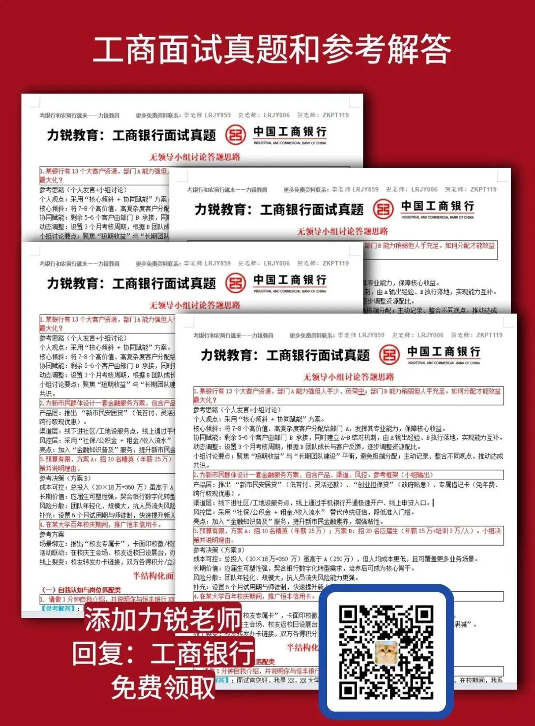 温馨提示:工行面试筹备时间极短,拿到真题越早,备考越从容,避开淘汰雷区,抓住国有大行上岸机会,添加微信,即刻领取!