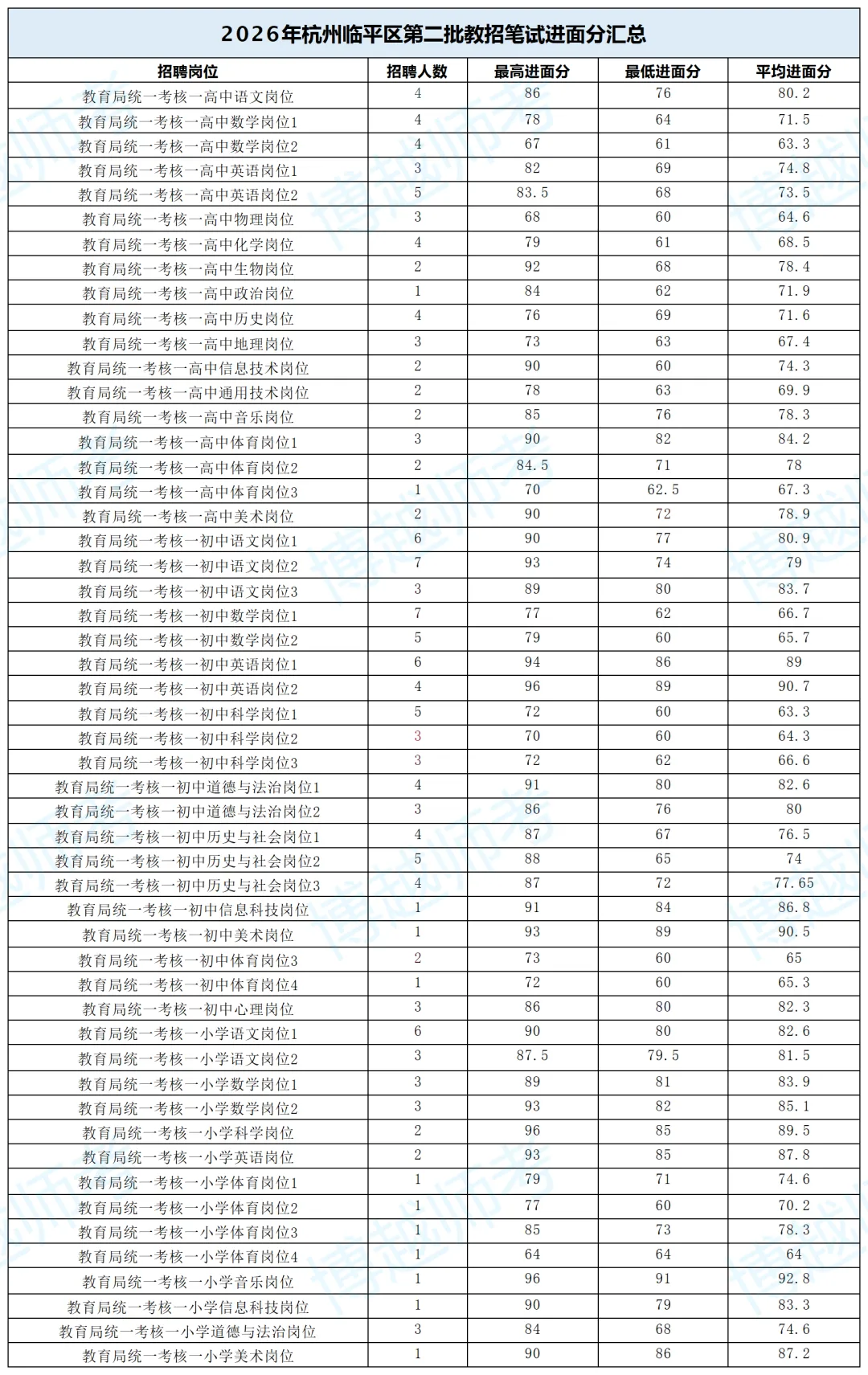 2、初中学段:整体竞争激烈,进面分区间为 60-96 分,平均进面分集中在 63.3-90.7 分,英语、美术岗位分数显著偏高,科学、体育岗位门槛相对宽松。