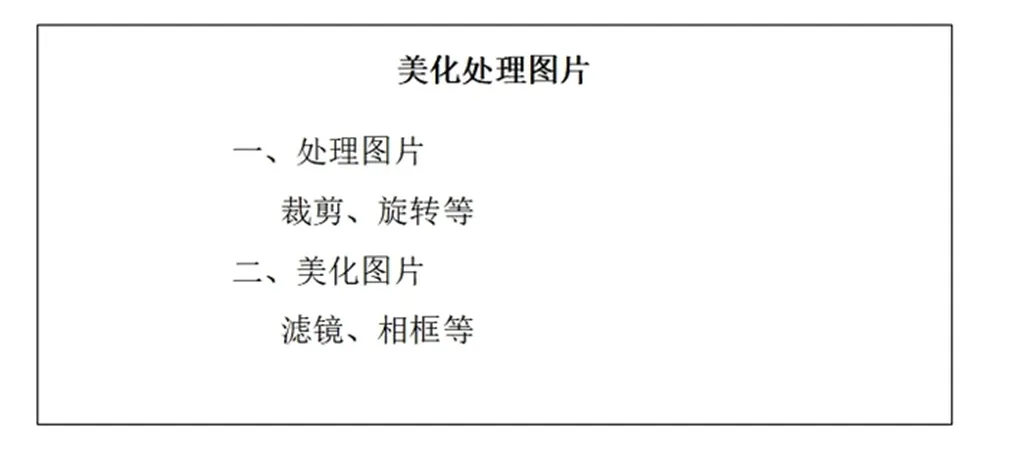 同学们,现在就请大家先认真观看电脑中的图片,寻找其中存在的问题。然后带着找到的问题,请大家以信息技术小组为单位,利用8分钟的时间,根据图片的问题探究处理办法,大家开始吧!【板书:一、处理图片】老师看到大家都在认真讨论,时间到,哪个小组代表想来分享呢?5组代表你来说,他说主体倾斜可以采用旋转图片解决,如果画面太暗,可以采用调整亮度解决。3组代表有补充,你来说,他说如果主体不突出,可以采用裁剪图片解决,如果出现无关内容,可以采用消除无关内容解决。两位同学找的问题很精准,办法很具有针对性,请坐。【板书:裁剪、旋转等】良好图片的基本要求:图片主体端正并突出、亮度正常、没有无关内容等。接下来我们要动手处理这些图片了,老师先给大家演示一下,首先我们找到需要调整的图片,分析存在的问题及原因,提出处理办法,接着打开美图秀秀,找到相应功能进行调整,最后保存图片就可以了。老师已经演示完成了,请大家模仿老师的操作处理图片吧!老师看到大家都完成了,我们一起来看看大家的图片,经过对比发现,大家处理图片使用的方法非常精准。