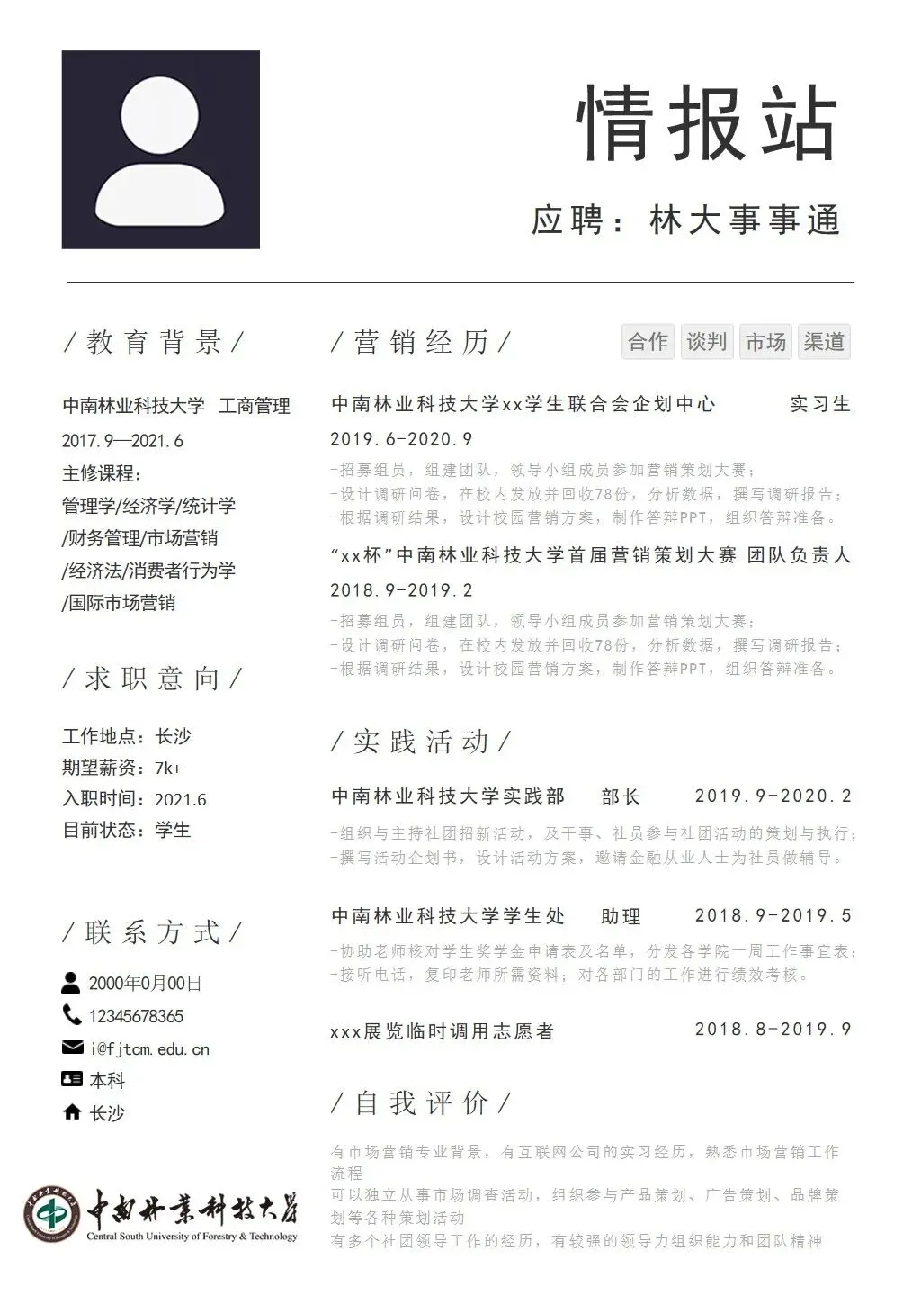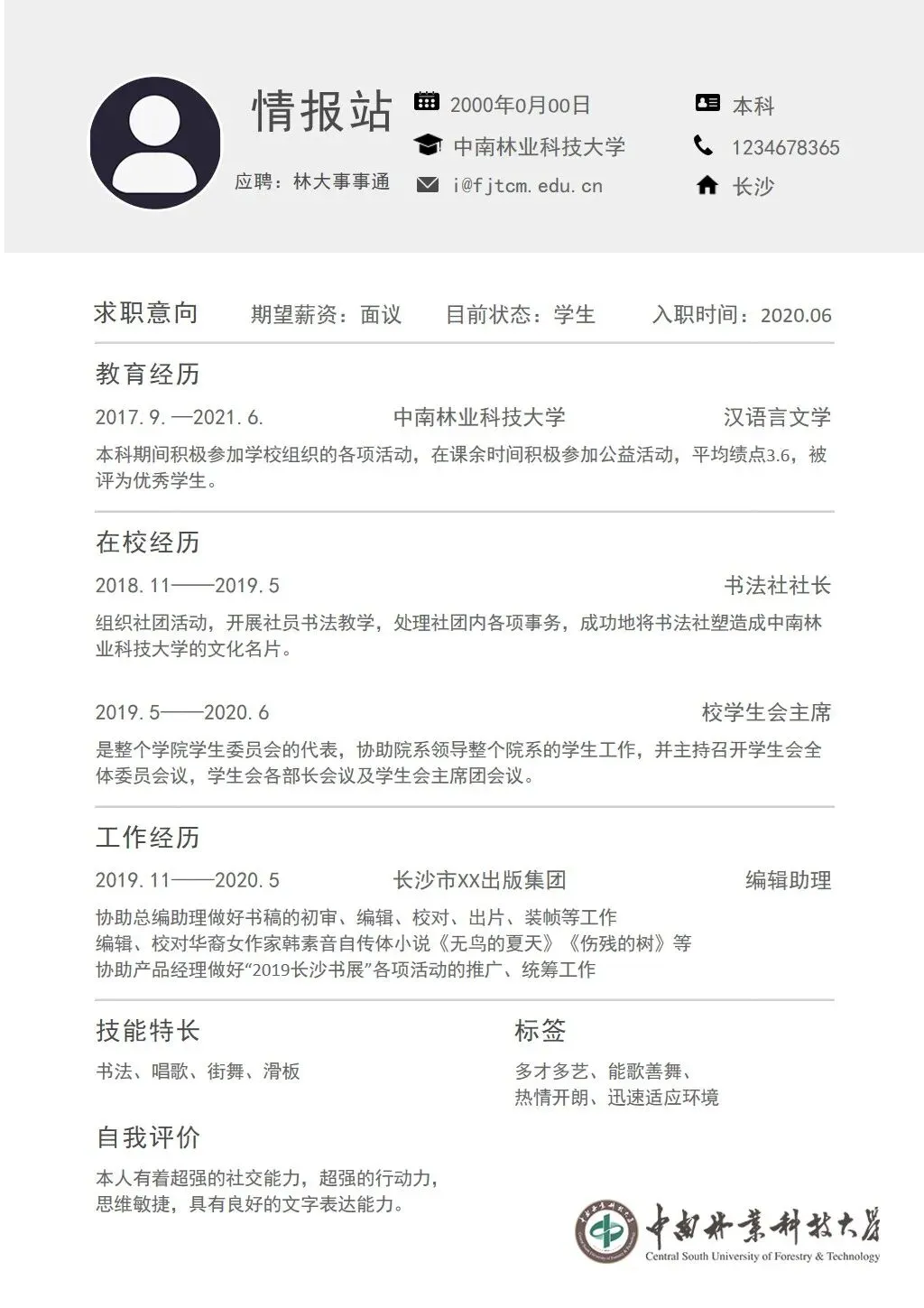 中南林业科技大学专属简历模板来啦~