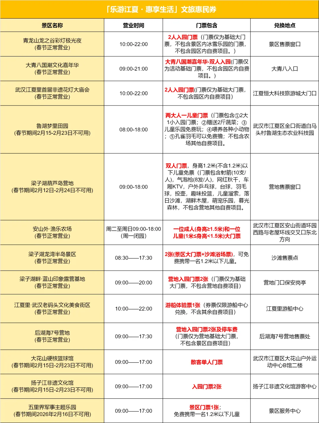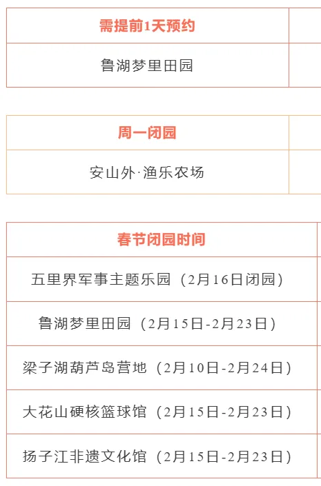 5.此次活动门票节假日通用,鲁湖梦里田园需提前一天电话预约,安山外渔乐农场周一闭园,五里界军事主题乐园2月16日闭园;扬子江非遗文化馆、大花山硬核篮球馆、梁子湖葫芦岛营地、鲁湖梦里田园春节暂停营业,其他景区中签成功后无需预约,使用有效期内可在相应景区开放时间免景区门票进入,特殊情况除外。(如景区闭园维修建设、重大活动期间暂不接待的,以各景区通告为准)