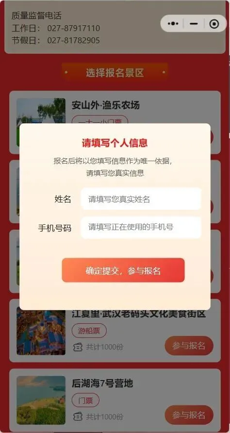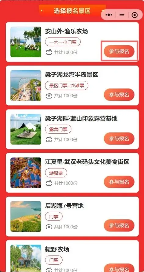 进入“游江夏”官方微信公众号,点击下方菜单栏【惠民预约】活动预约页面,选择想预约的景区,点击“参与报名”按钮,填写“姓名+手机号码”后提交即报名成功。