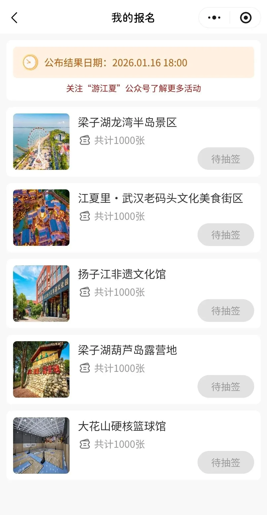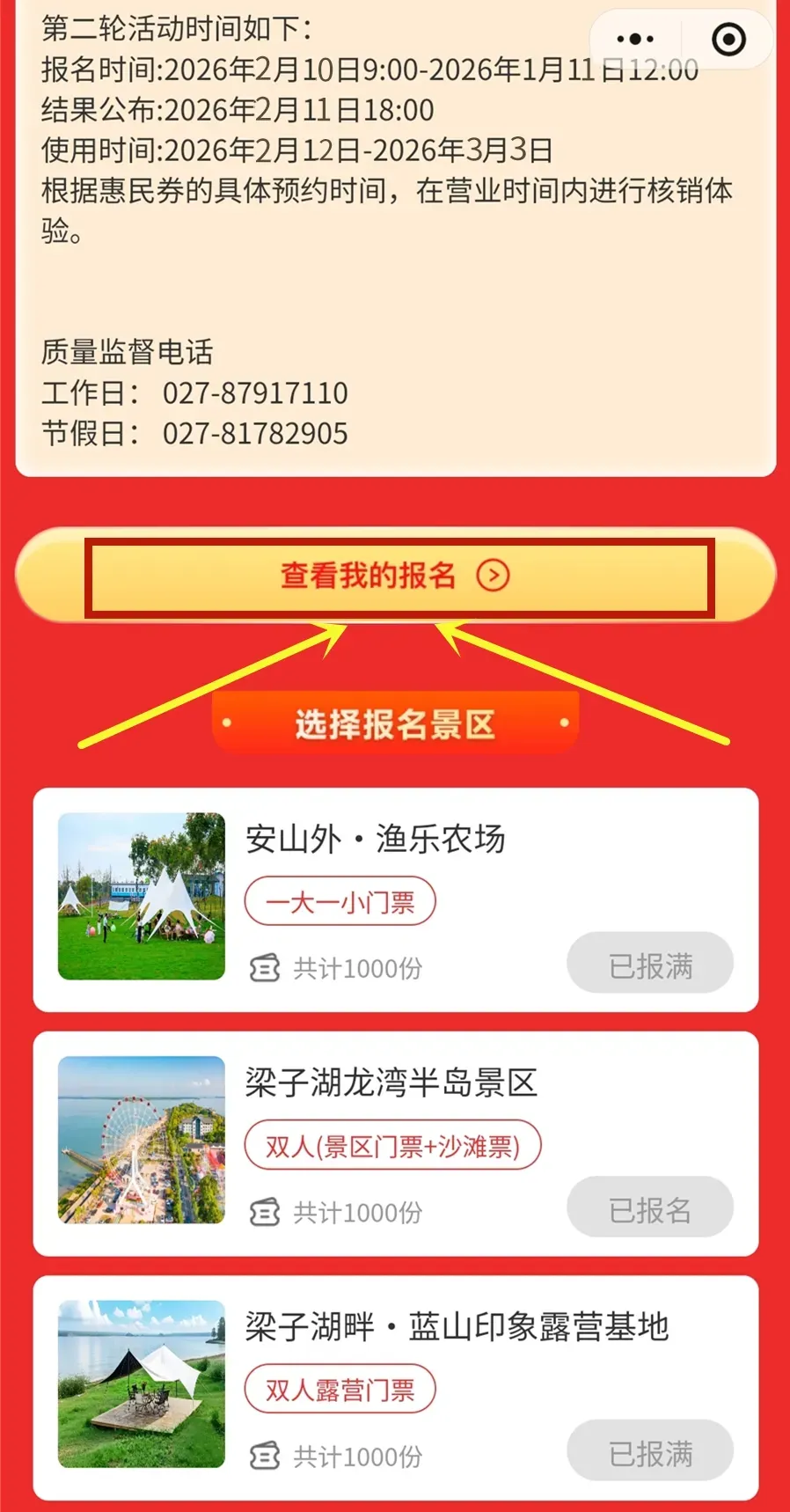 提交报名后,点击“查看我的报名”查看报名,等到2026年2月11日18:00中签结果公布后,若结果显示“已中签”,则表示已成功预约该景区的免费门票!