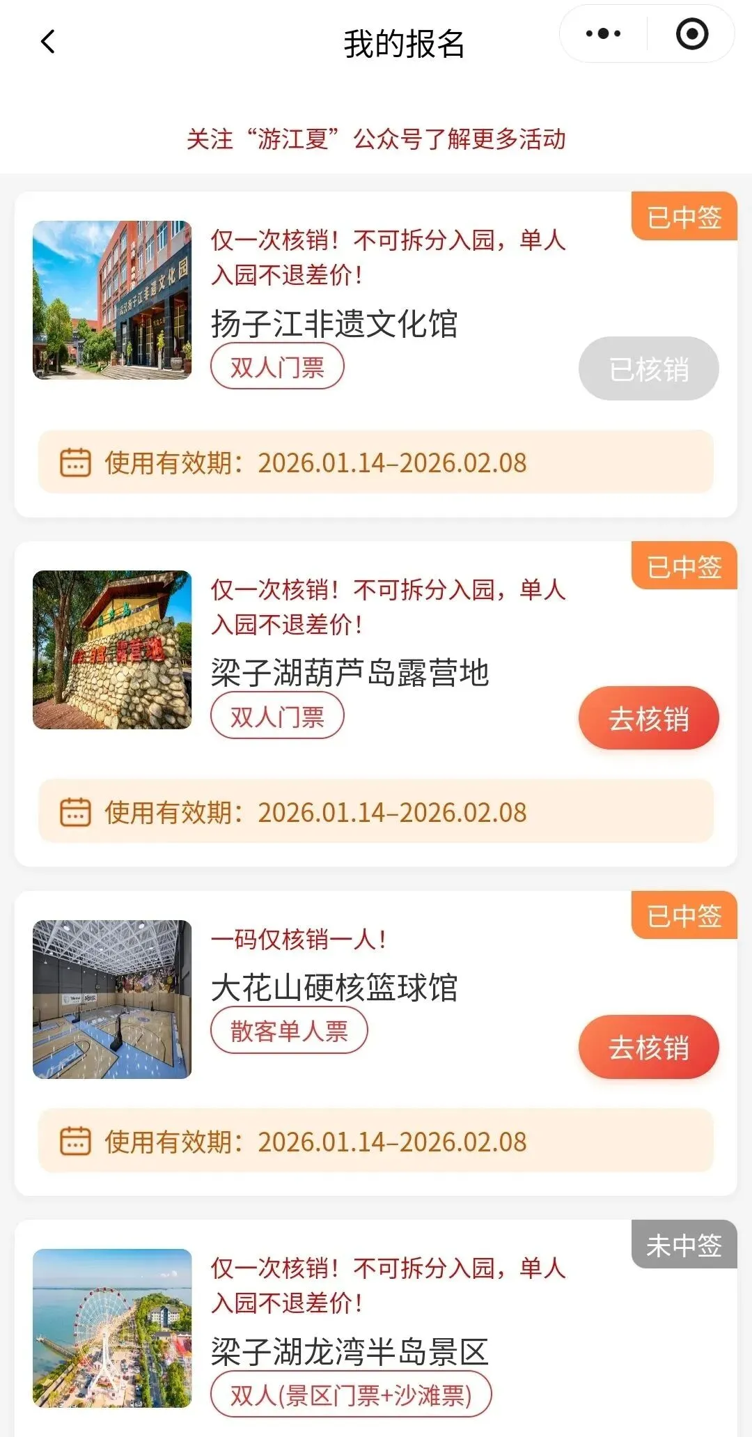 2.中签后,根据订单上的使用日期,持核销二维码(点击“去核销”获取),前往景区指定兑票点,各景区核销人数规则以景区详情页说明为准。