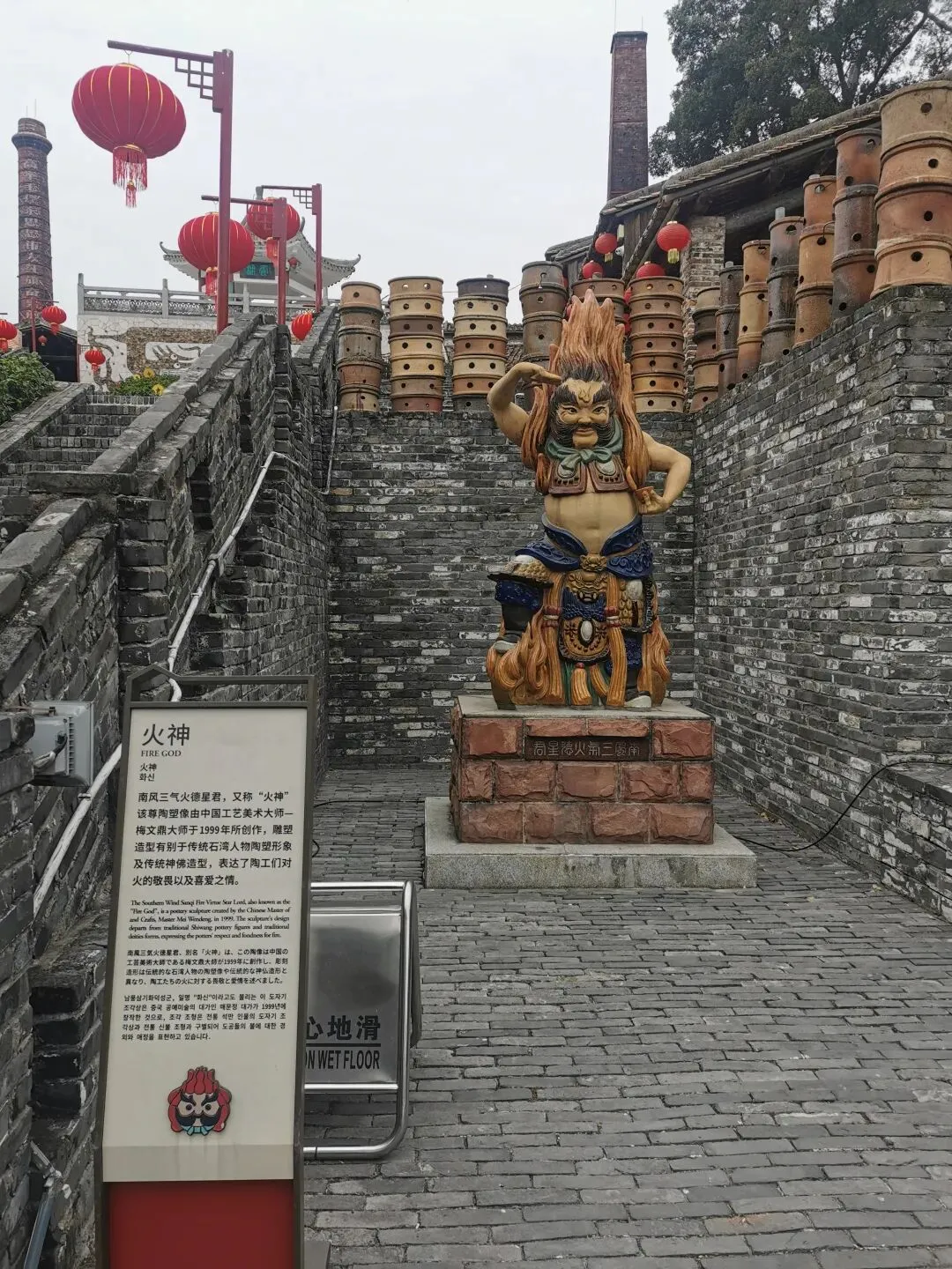 来到景区门口一个大大的烟窗高高耸立着 ,就像卫兵守卫着城门一样。南风古灶,又名“龙窑”,位于广东省佛山市禅城区石湾镇,因其五千年的制陶历史而著名,景区内南风古灶和高灶两条古陶窑,窑火不绝,生产从未间断已有五百年之久。南风古灶以“世界保存最完好、持续使用时间最长的传统柴烧龙窑”,载入了世界吉尼斯之最。
