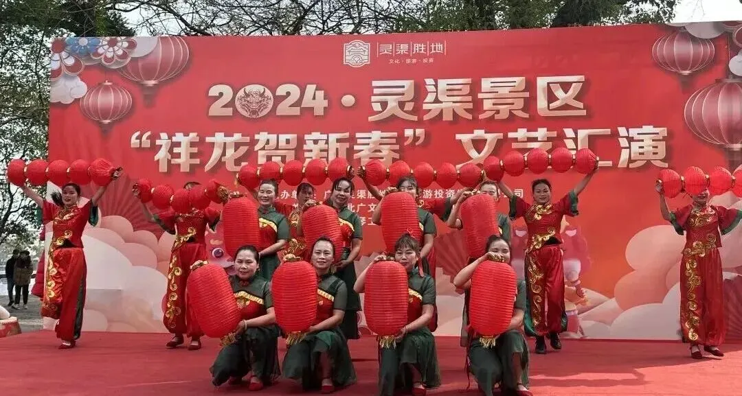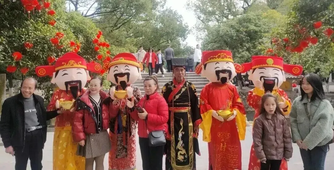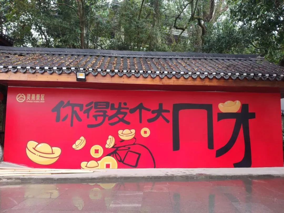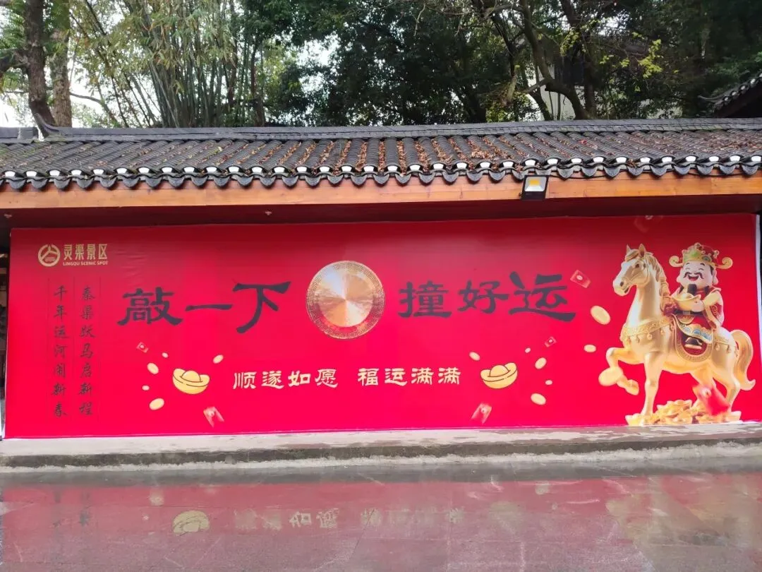 景区核心游览区设置 5 面网红打卡背景墙,分别有:“好运降铃”、“你得发个大财”、“红包瀑布”、“撞好运”、“拍马屁”,游客可依次打卡五面主题墙,拍照留影、集福纳祥,营造 “游灵渠、接五福、行大运” 的节日氛围。