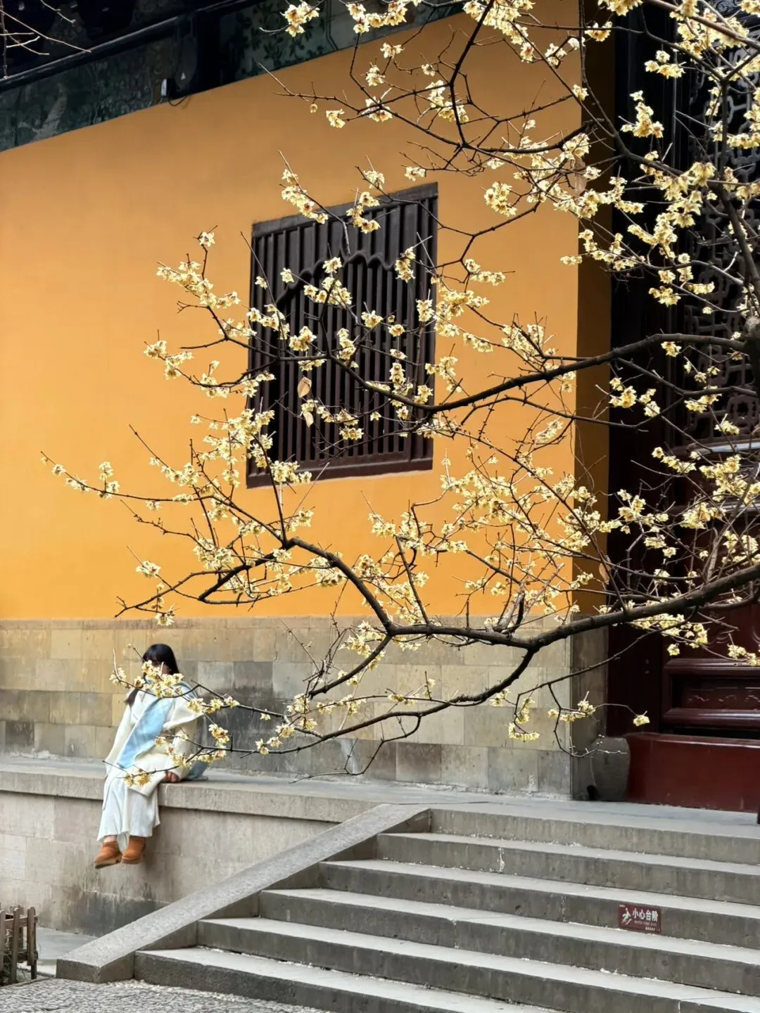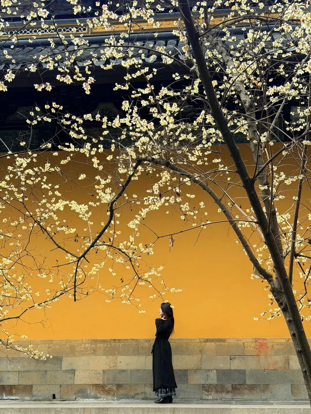 大雄宝殿后侧:以垂落的梅枝为前景,人物站在黄墙前拍摄背影或侧影