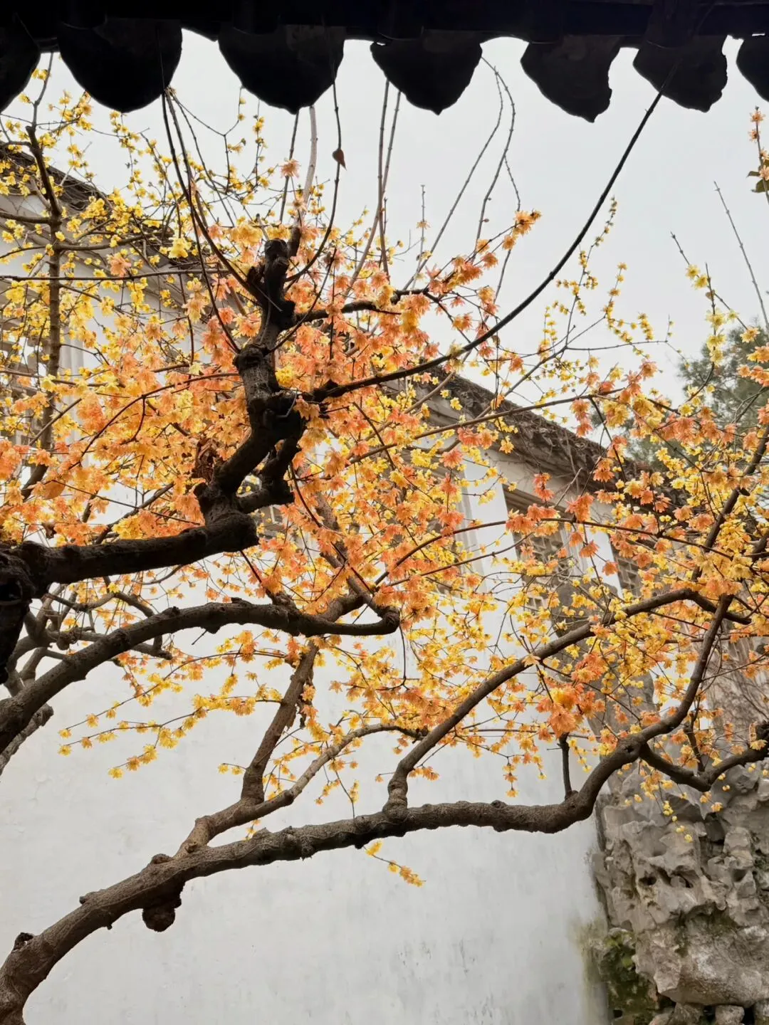 这里有高大的腊梅树依假山而植,鹅黄色的花朵与灰褐的湖石形成鲜明对比,古朴而有诗意。