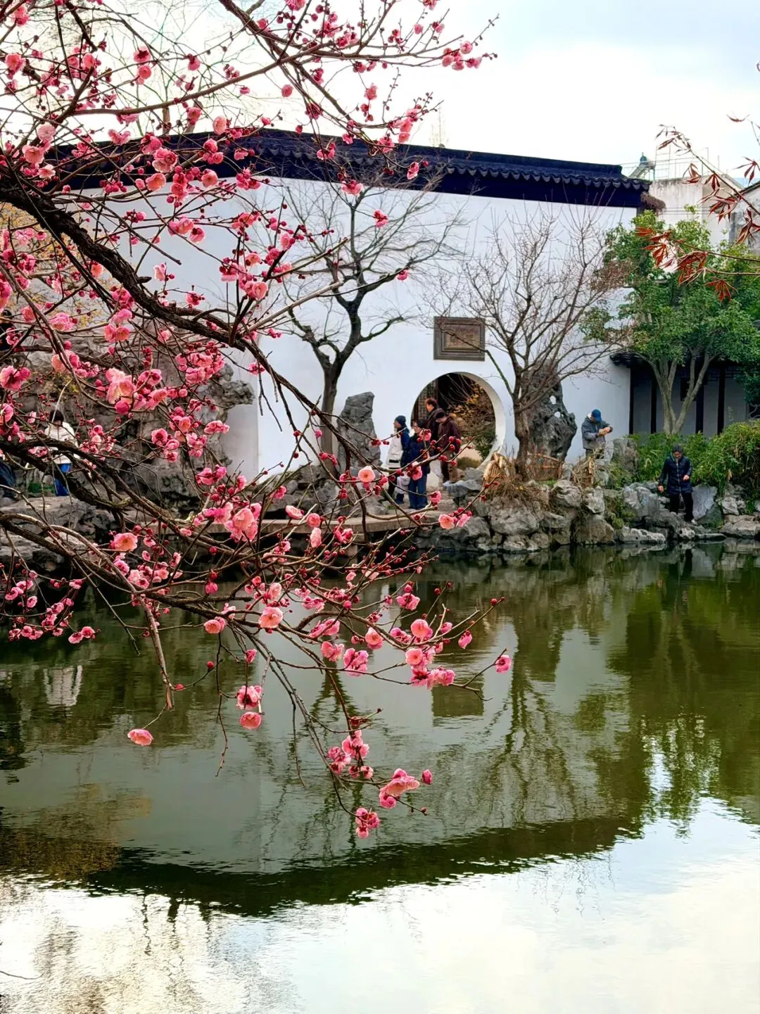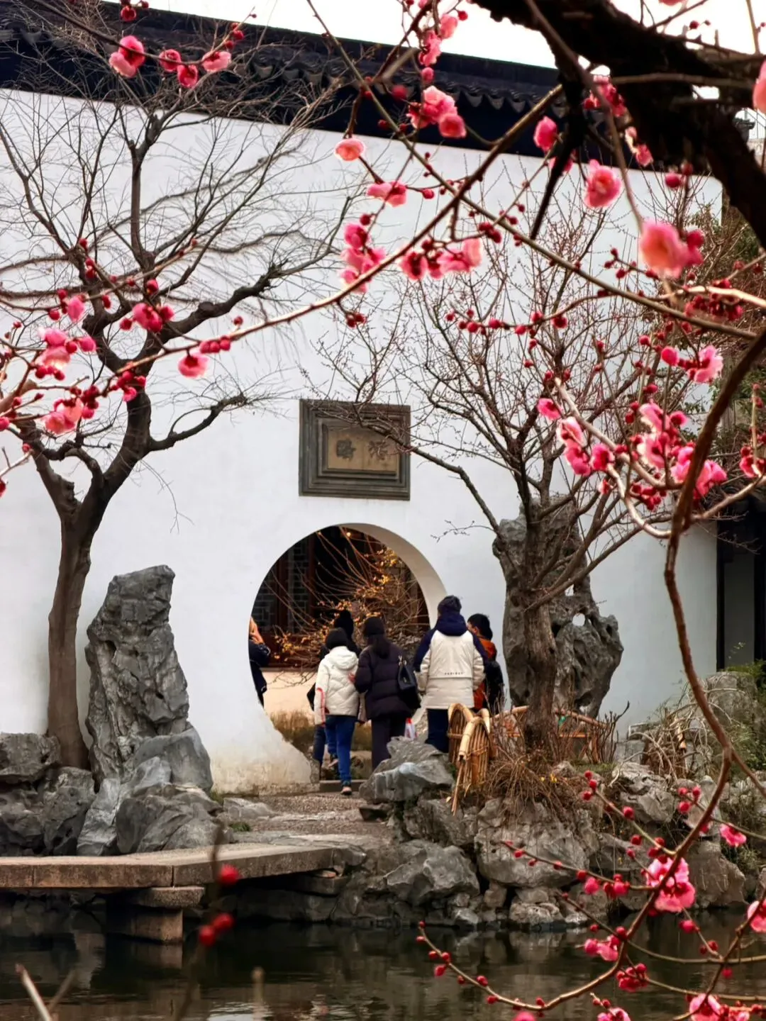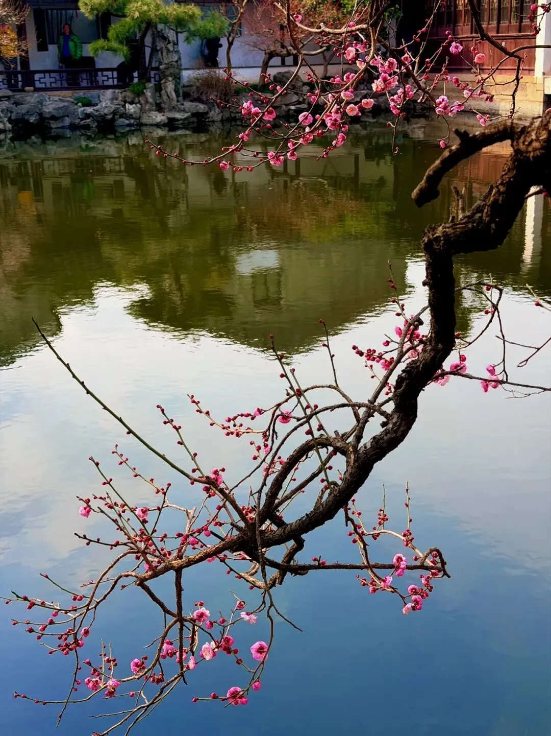 艺圃的梅花主要分布在水池周边,临水而栽,能拍出花影与古建倒映水中的经典画面。