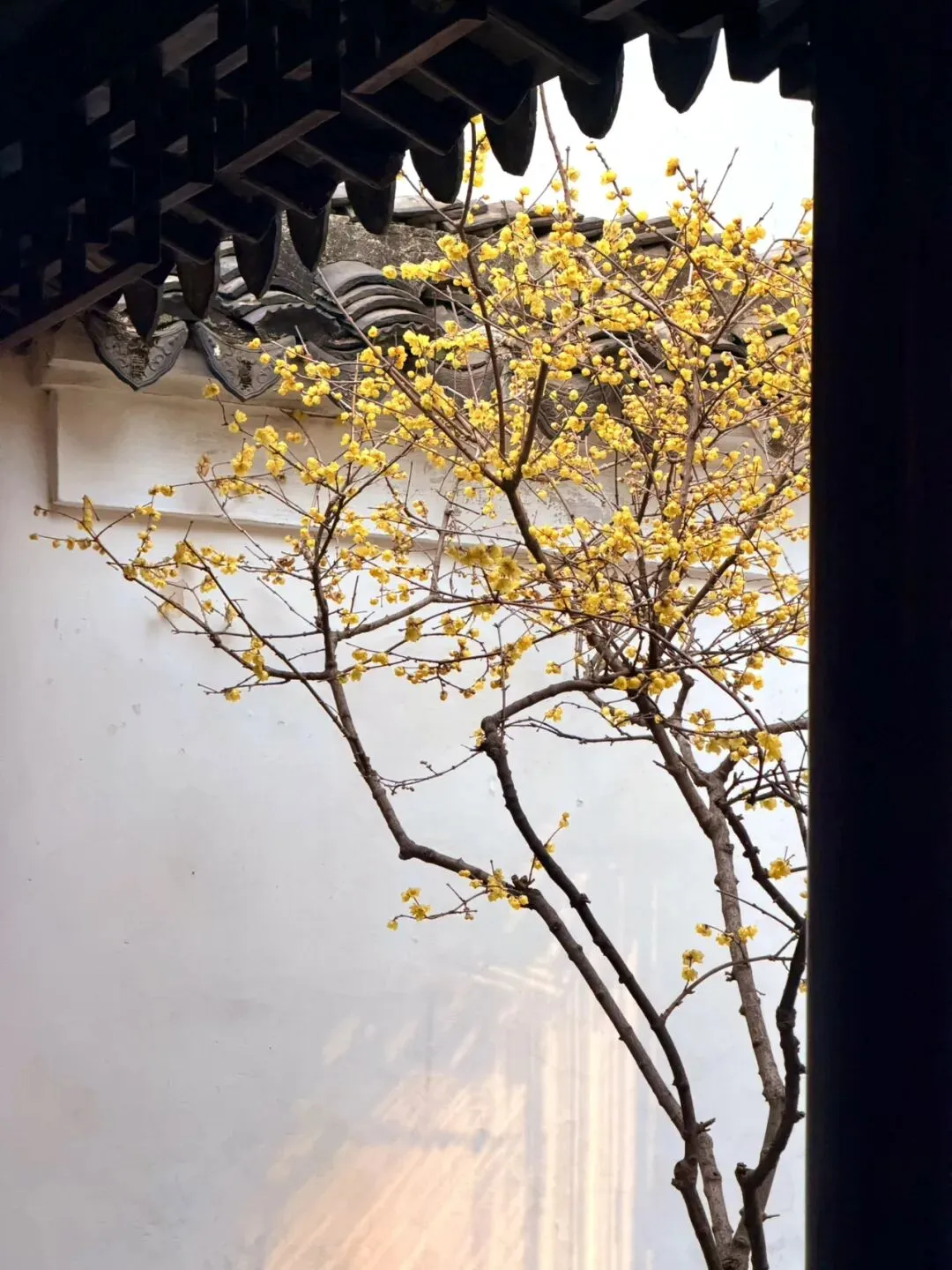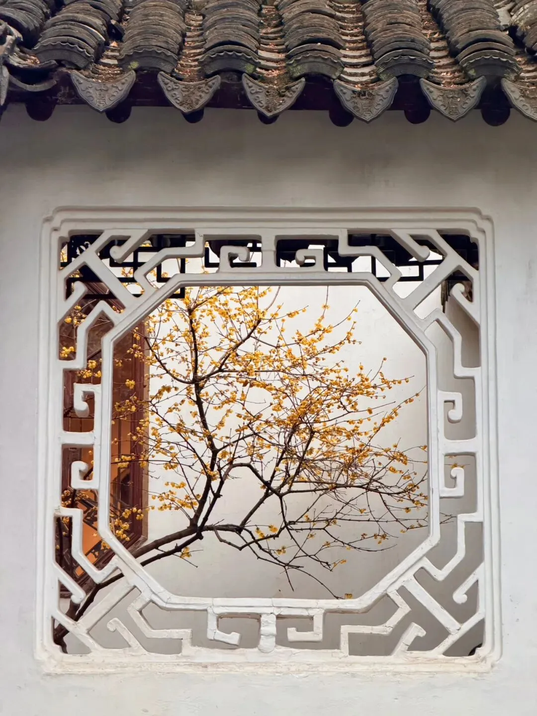 在苏州狮子林,腊梅与园林的窗框、门洞结合,是冬日里最经典的框景。其中,小方厅是公认观赏这一景致的最佳位置。