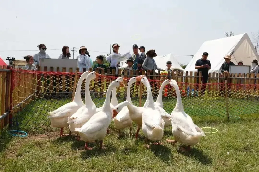 出口处的大草坪上,超接地气的抓鸡套鸭比赛欢乐开赛!凭景区门票即可兑换参赛资格,每人限参与1次。想体验徒手抓鸡的快感?跑道终点已备好肥硕土鸡,一声令下,率先抓到的游客就能直接抱回家!偏爱套圈的朋友,10元10圈,可购买塑料套圈瞄准围栏内的鸭子,精准套中就能把鲜活鸭子带回家。现场有工作人员全程维持秩序,提醒安全事项,避免家禽受惊,让大家玩得尽兴又安心。