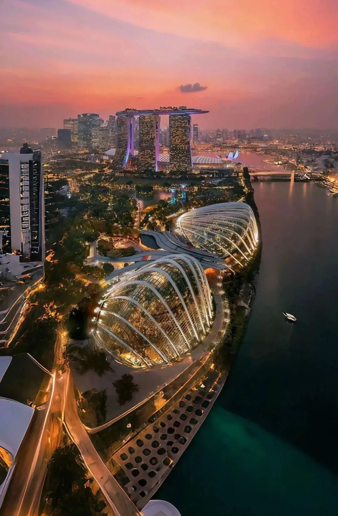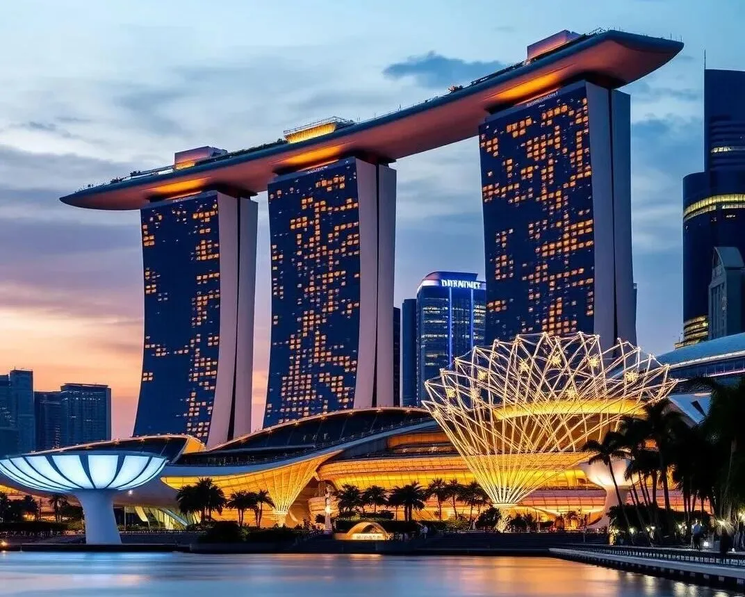 沿着滨海湾步行,不远处便是那艘“停泊”在高楼之上的帆船酒店——滨海湾金沙。它不是普通的酒店,它已远超酒店的范畴,是一件融合了建筑奇观、工程科技与都市野心的艺术品。尤其当夜幕降临,建筑灯光亮起,与星空、海水倒影交相辉映。