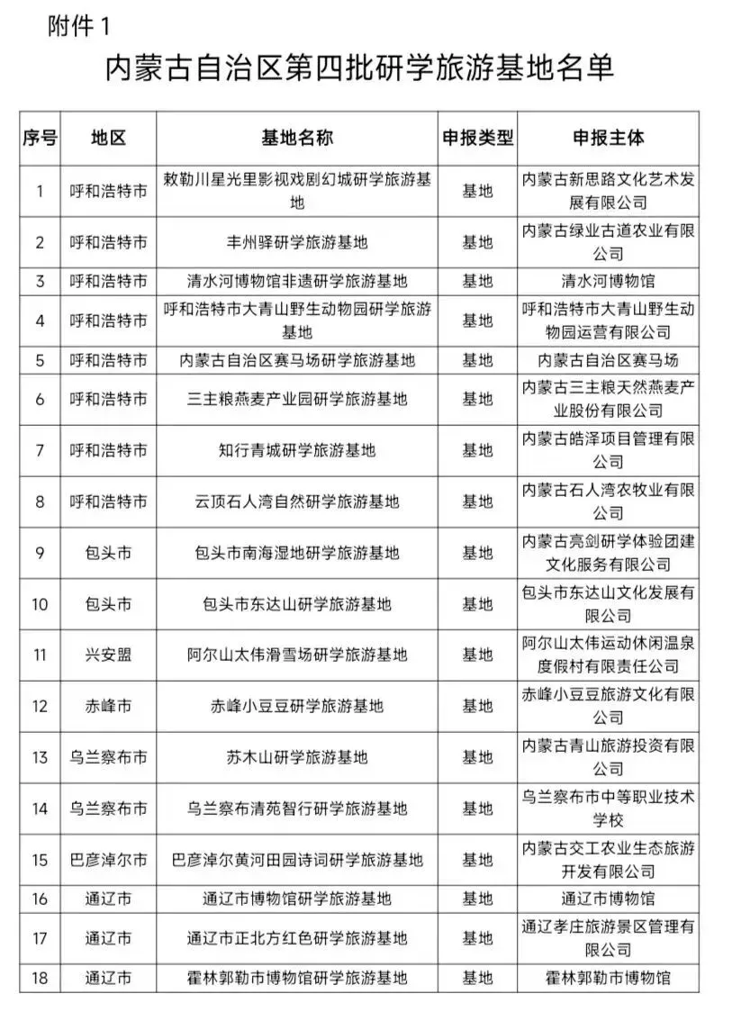 1.内蒙古自治区第四批研学旅游基地名单