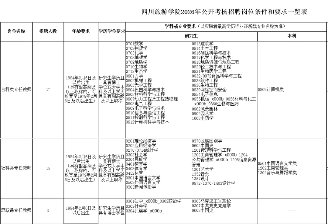 面向全国招聘符合《四川旅游学院2026年公开考核招聘工作人员岗位和条件要求一览表》(含表注,以下简称《岗位和条件要求一览表》)相关岗位条件要求和本公告其他要求的人才。
