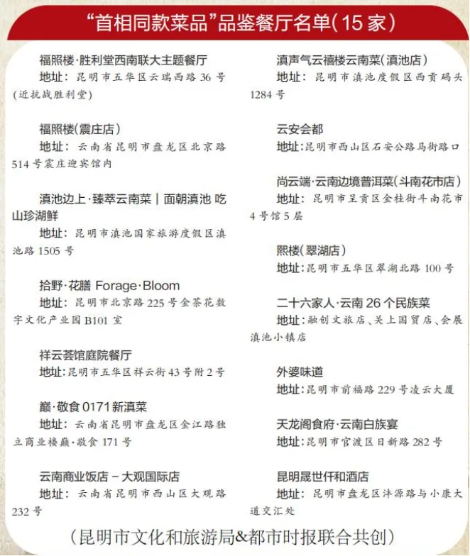 首批公布的餐厅包括福照楼·胜利堂西南联大主题餐厅、滇池边上·臻萃云南菜、拾野·花膳Forage·Bloom、祥云荟馆庭院餐厅、云安会都、尚云端等15家特色餐饮企业。在这些餐企中,很多家都能提供首相菜单上的完整菜品。