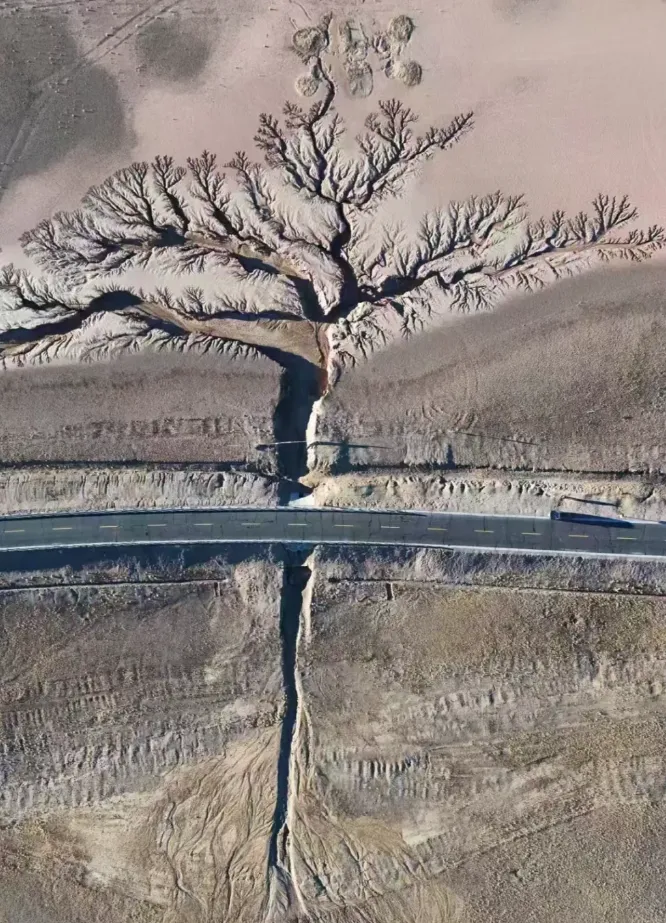 在藏北无人区的边缘,达则错湖畔的盐碱滩上,潮汐退去后留下的水痕如树枝般蔓延开来,从高空俯瞰,一棵巨大的"树"生长在大地之上。