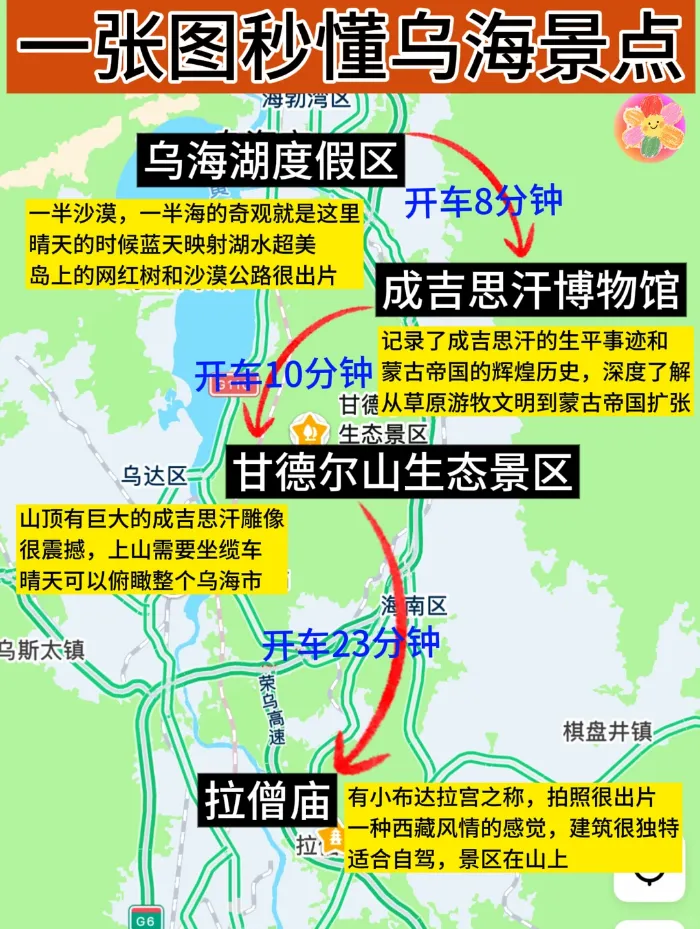 ✅ 交通攻略:呼和浩特白塔机场飞乌海机场(约1.5h),或包头站高铁至乌海西站(约2h)