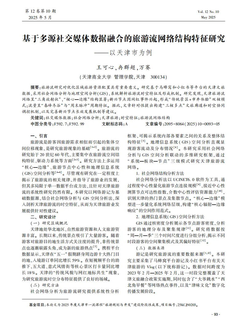 在数字化时代,社交媒体数据成为洞察旅游行为的重要窗口。本研究通过融合多源社交媒体数据,深入分析天津市旅游流网络的结构特征,揭示游客行为模式与城市文旅资源的互动关系,为天津文旅宣传提供科学依据与创新思路。