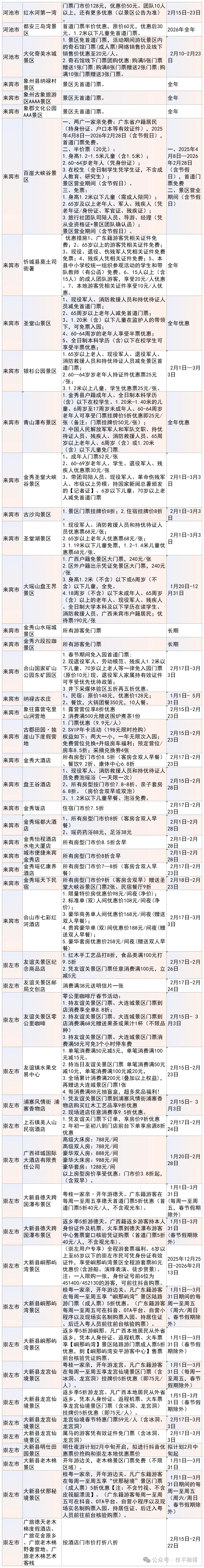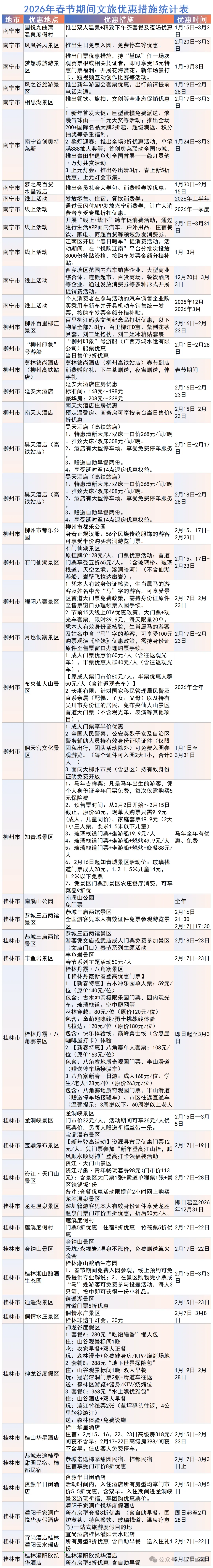 2026年春节将至,广西文旅优惠惊喜来袭!全区14市推出200余项文旅优惠措施。优惠时间从1月持续到3月,涵盖各类场所。