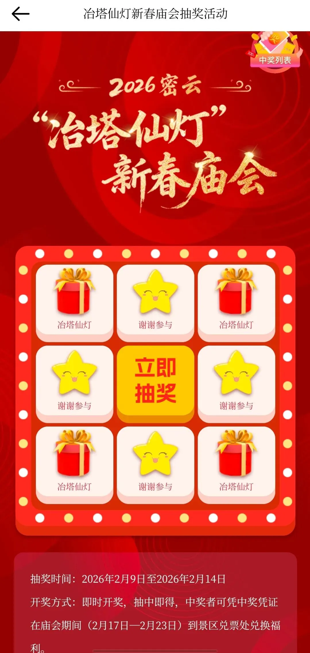 参与方式:下载并登录「生态密云」APP,进入首页【2026 密云 “冶塔仙灯” 新春庙会】专区,点击活动入口后选择 “立即抽奖” 即可,系统即时开奖,结果实时显示