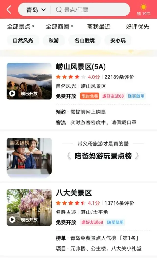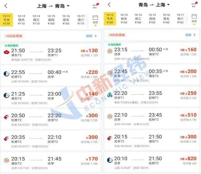 中新经纬记者以游客身份致电青岛景区时,一位青岛市崂山风景区的工作人员表示,“暂时没有接到景区封闭相关通知,疫情期间出行可提前关注景区动态。”另一位青岛方特梦幻王国乐园的工作人员也称,“暂未接到闭园通知或限流通知,无论是本地游客还是外地游客,只要健康码和体温均正常即可入园。” 中新经纬记者又以游客身份致电多家旅行在线平台了解到,多家旅行社不建议近期前往青岛旅游。一位携程平台上某旅行社的工作人员称,“从昨晚开始,陆续有游客咨询去青岛旅行是否需要进行核酸检测,我们给出的回复是,旅行社这边暂未接到相关通知,游客暂时可正常预订,但我们还是不建议游客近期去青岛旅游。”一位去哪儿平台上某旅行社的工作人员也称,“平台可以预订前往青岛的跟团游或定制游服务,但可能因政策调整而被临时取消,建议最好改选其他旅游路线。” 青岛12日景区开放信息 图源:美团截图 作为山东重要的滨海度假旅游城市,青岛旅游资源非常丰富。为加快促进旅游业复苏,拉动旅游消费,青岛文旅局于7月31日发布公告称,自2020年8月1日至2020年12月31日,该市崂山风景区、海滨风景区小青岛、海滨风景区小鱼山、奥帆博物馆、大珠山风景名胜区、琅琊台风景区等12家国有政府定价A级旅游景区面向国内外游客免门票开放。 据青岛文旅局数据显示,2020年国庆、中秋8天长假期间,青岛市共接待游客总人数447.58万人次,实现游客消费46.45亿元,按可比口径分别下降40.92%、50.21%。而据文化和旅游部数据中心统计,国庆假期前7天,全国共接待国内游客6.18亿人次,实现旅游收入4543.3亿元,同比恢复69.9%。 机票价格方面,从青岛发出的航班相比前往青岛的航班机票价格高。飞猪平台机票信息显示,10月12日,北京大兴机场飞往青岛流亭机场的东航MU5196航班经济舱仅1.4折,售价200元;同日,青岛流亭机场飞往北京首都机场的山航SC4657和山航SC4649经济舱均为3.4折,售价600元。另外,今天(12日),上海飞往青岛的航班经济舱票价在130元至550元之间,而青岛飞往上海的经济舱票价在160元至1060元之间。 从上海往返青岛的机票价格 图源:中新经纬