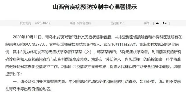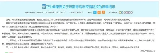 上述提示要求,10月12日起,从青岛市中高风险地区返黔人员需提供7日内核酸检测证明,如无法提供核酸检测阴性证明的,应立即接受核酸检测或14天隔离医学观察。广大群众如非必要,近期不要前往青岛市;如必须前往,请务必全程做好个人防护。 贵州省卫生健康委官网截图 10月12日上午,济南日报微信公众号消息称,济南市委统筹疫情防控和经济运行工作领导小组(指挥部)于11日晚召开视频调度会议对疫情防控工作进行紧急部署。会上表示对9月23日以来青岛入济返济人员按要求进行2次核酸检测,1次血清抗体检测(2次核酸检测间隔24小时)。对即日起青岛新入济人员严格按照“2+1+7”(即2次核酸检测、1次血清抗体检测、7天健康监测)防控要求进行管控。 10月12日,山西省疾病预防控制中心发布提示称,近期去过青岛市,特别是9月27日以来到过青岛市胸科医院、接触过医院病人、与上述人员有过接触的人员,如出现发热、咳嗽等症状,要佩戴一次性医用口罩及以上级别口罩,立即到就近的医疗机构发热门诊进行排查诊疗,就医途中请全程做好个人防护,尽量避免乘坐公共交通工具。如与青岛市确诊病例、无症状感染者行程轨迹有交集,请及时与所在社区联系,尽快进行核酸检测和隔离观察。 山西疾控还要求公众密切关注掌握国内高、中风险地区的动态变化和病例的行动轨迹。如非必要,请近期不要前往青岛市等出现疫情的地区。 山西省疾病预防控制中心官网截图 10月11日晚,湖北省疾病预防控制中心发布紧急提示称,现居住该省,且与青岛市无症状感染者行程轨迹有交集,特别是9月27日以来到过青岛市胸科医院、接触过医院病人、与上述人员有过接触的人员、接触过近期从青岛市入境人员以及青岛市市北区的市民,应主动向所在社区报备相关情况,接受社区健康管理并按要求进行核酸检测,主动配合当地政府其他相关防控措施。 此外,湖北疾控还表示,如确需前往青岛,请务必做好个人防护;从青岛市返鄂后,应主动配合我省的相关防控措施。 另外,截至10月12日发稿,辽宁、吉林、黑龙江绥化、河北唐山、河南郑州等多地也发布了类似的出行提示通知。