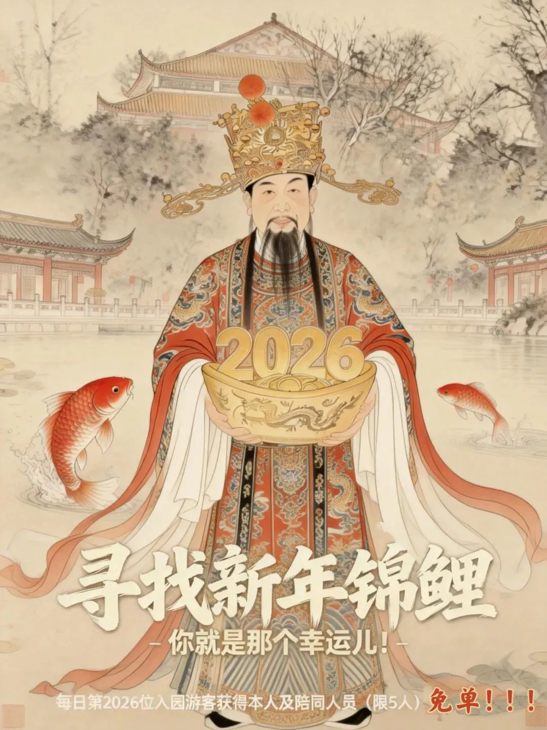 锦鲤免单礼:2月17日-12月22日(正月初一至初六),每日入园的第2026位“锦鲤”,将获得本人及4位同行人员的当日景区免单大奖(飞天山门票、观光车、竹筏、游船)。