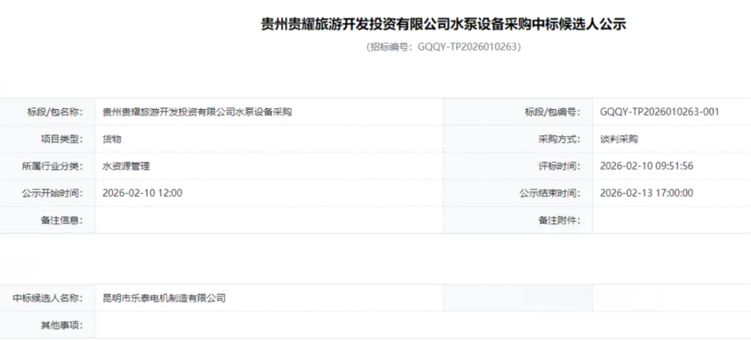 捷报传喜,聚力前行!近日,昆明市乐泰电机制造有限公司(以下简称“乐泰水泵”)凭借过硬的产品品质、精准的定制化解决方案以及完善的服务体系,在众多竞争者中脱颖而出,成功中标贵州贵耀旅游开发投资有限公司(以下简称“贵州贵耀旅游”)温泉用泵采购项目。此次合作,既是乐泰水泵深耕西南市场、拓展文旅领域的重要突破,更是企业践行社会责任、助力贵州旅游高质量发展的生动实践。