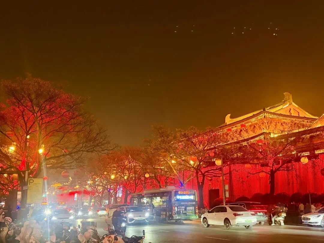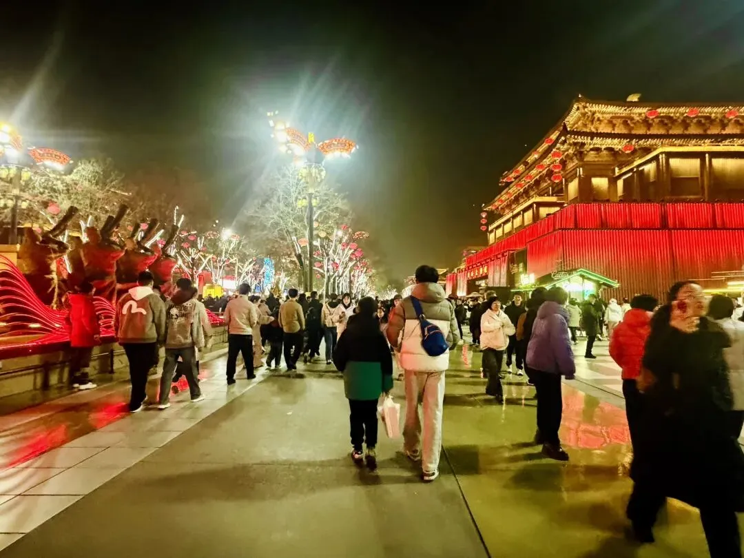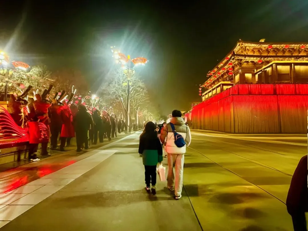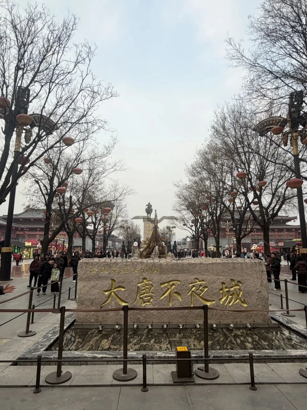 吃完饭必须散散步,大唐不夜城的夜景果然名不虚传。灯火如昼,人流如织,仿佛重现昔日“长安大道”的盛世气象。走在街上,看流光溢彩映着唐风建筑,耳边是隐约的笙歌与笑语,这场穿越千年的繁华夜游,为我们的长安之旅画上了最灿烂的句号。