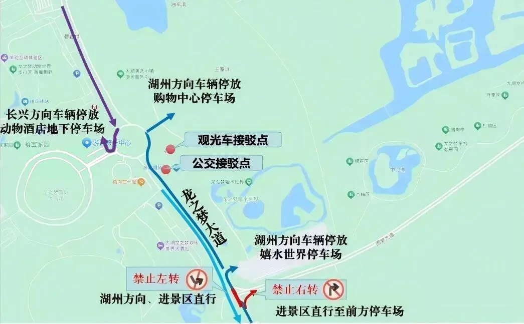龙之梦太湖演艺城表演高峰车流核心区停车场满载后进景区的车辆流向图
