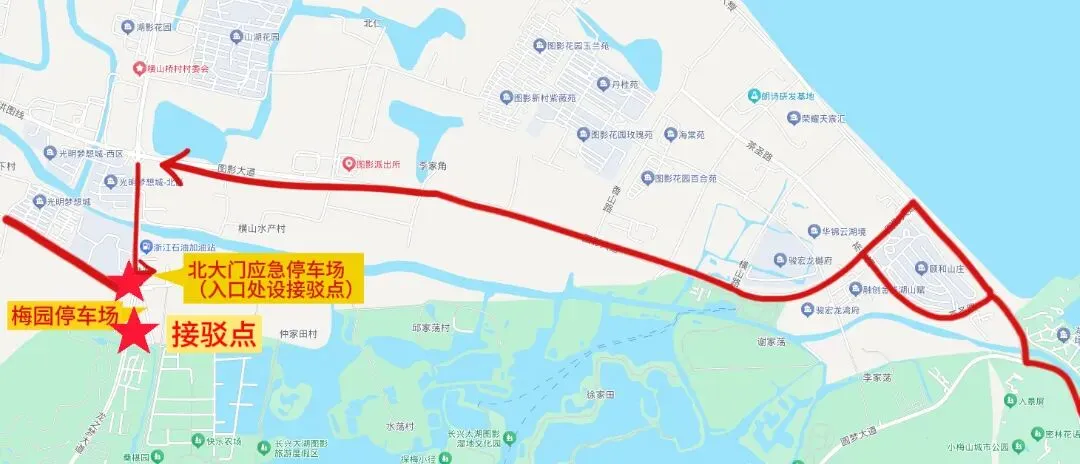 2、滨湖大道、图影大道、杨小线方向进景区:龙之梦大道——北大门应急停车场,可到接驳点乘坐免费的公交接驳车进景区。