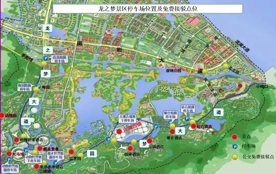 1、湖长二通道方向进景区:龙之梦大道——嬉水世界停车场或购物中心停车场;长兴方向进景区:车辆停放动物酒店地下停车场。可到接驳点乘坐免费的公交接驳车进景区,也可以乘坐收费的观光车进景区。