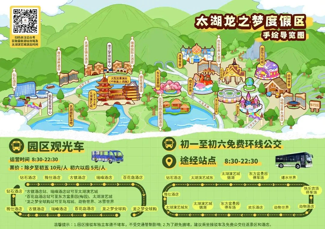 为了所有游客的出行便捷,住店游客将车辆停放在酒店内停车场,防止动用车辆引发拥堵,乘坐园区免费公交往返景点和酒店。