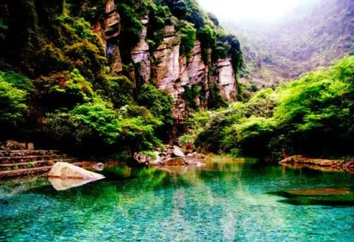 黄龙寺前对天王峰,后枕玉屏峰,西为赐经亭,下临大溪,寺宇为万山环抱,松杉碧绕,修篁蔽日,景色奇幽。