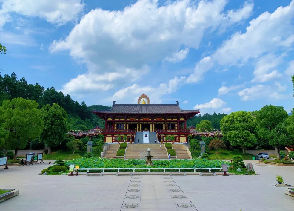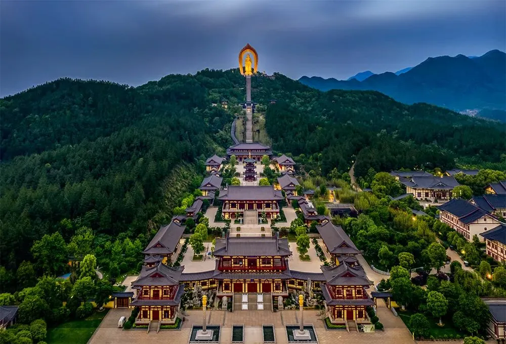 东林大佛位于江西省九江市庐山西麓,因处于西林寺以东,故名东林寺。自建造以来,至2014年已有1600多年历史,沧桑历尽,屡废屡兴。1983年,被国务院列为汉族地区佛教全国重点寺院、国家著名佛教道场、江西省三大国际交流道场之一。整个东林净土苑依山就势,将中轴线规划为天王殿、三圣殿、大雄宝殿、拜佛台、接引桥、大佛台等数个区域。步入东林寺,放眼望去青山拥抱,修竹掩翠之中的东林寺梵宇巍峨、栋接椽摩,气势十分恢宏,高大的文佛塔、碧瓦红墙的寺院错落有致,犹如一幅空灵秀丽的水墨画,古朴而庄严。