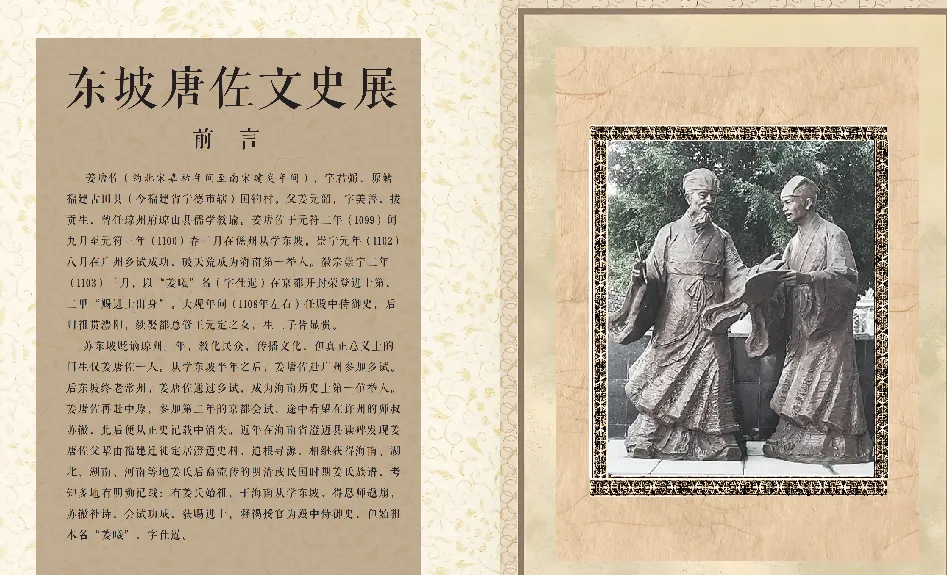 东坡唐佐文史展馆以详实的史料系统展示了东坡门生姜唐佐刻苦向学、终获成功的奋斗过程。 建设背景:2024年春,澄迈县发布《关于进一步推动澄迈东坡文化发展的实施意见》,提出“深入挖掘苏东坡与姜唐佐师生情谊的历史文化资源”。姜唐佐是海南历史上第一位举人,曾跟随贬谪海南的苏东坡求学半年,东坡为其题诗“沧海何曾断地脉,白袍端合破天荒”,这段佳话也成为海南文化史上的重要篇章。该文化苑由海南省苏学研究会与澄迈县老城镇姜氏村民共同策划,由姜氏村民(姜唐佐伯父姜元熹后裔)集资建设,历经一年时间,于2026年1月建成开放。由海南省苏学研究会姜唐佐研究专委会运营。