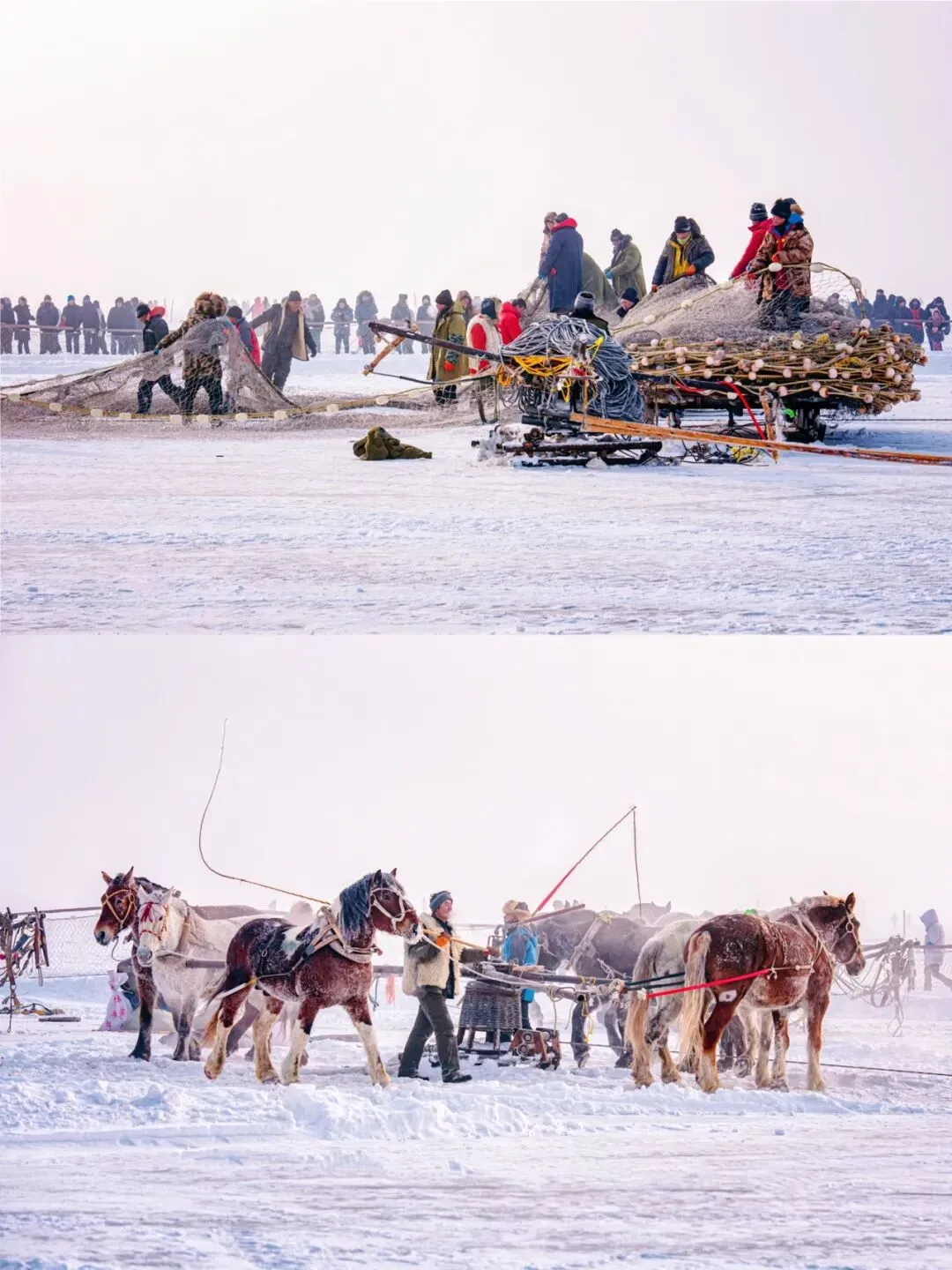 冰封的吉林松原查干湖上,晨曦微露。47岁的“渔把头”陈杰带领渔工们举行完“祭湖醒网”仪式后,一声号令,冬捕的大网缓缓沉入冰层之下。