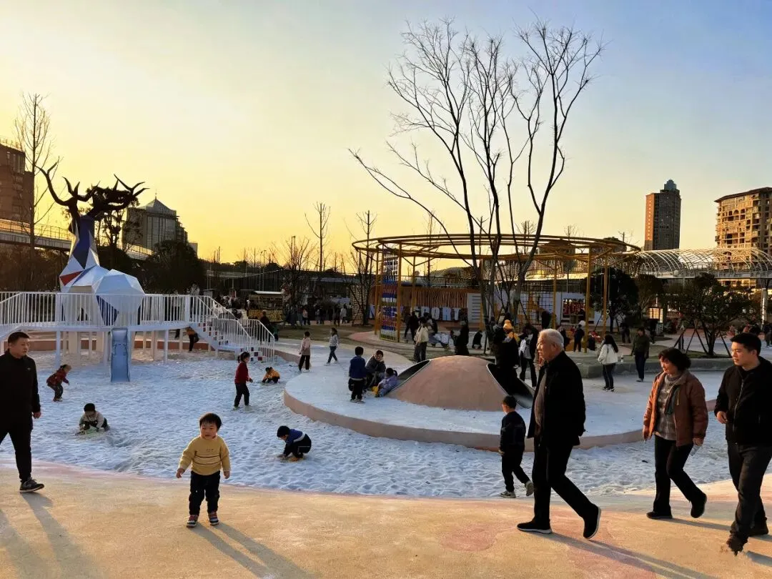 带娃首选体育馆外白沙地公园,柔软沙池+趣味滑滑梯,小朋友可以自由自在玩沙、奔跑、嬉戏,轻松撒欢一下午,解放家长双手超省心。这里还有网红小鹿打卡点,几何拼接的小鹿雕塑超上镜,是遛娃、拍照的绝佳背景板。
