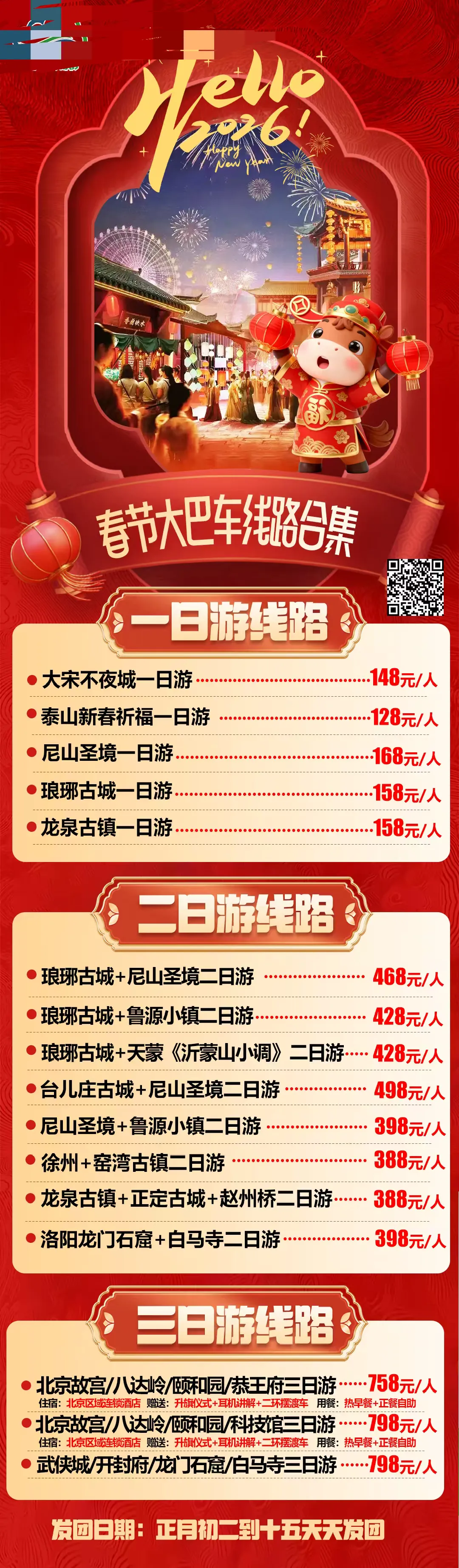 您现在的位置是:首页 > 国内旅游目的推荐 > 正文 国内旅游目的推荐 春节大巴旅游线路 admin2026年02月10日 17:31:34国内旅游目的推荐10 春节大巴旅游线路 转载请说明来源于"旅荐网",部分内容转载自网络,如有侵权请联系qlwl@foxmail.com删除 本文地址:https://www.15386.cn/post/100433.html 上一篇 景区通告:趵突泉景区“趵突夜画”项目暂停演出 下一篇 新疆喀纳斯景区一对母女落入冰河险被冲走,路过游客脱下外衣合力救起两人,:人没事 相关文章 这是一期苏州旅游攻略(2) 4月去河南/西安旅游太香了:潮汕人专属全攻略,这篇帮你选对线路! 北京旅游避坑指南六:报团的坑点你要明白 文明旅游|张家口堡景区文明旅游指南 三亚旅游消费陷阱识别与规避指南(2026最新版)仅供参考. 西安旅游全攻略|25个私藏好去处,赏花逛古都不踩坑 2025研学旅游指导师招募合作单位及学员 广州 3 月旅行攻略|花城 + 老城 全攻略 重庆观音桥一日游|附保姆级打卡游玩攻略 成都旅游攻略直接省麻了 发表评论 取消回复 评论列表 这篇文章还没有收到评论,赶紧来抢沙发吧~