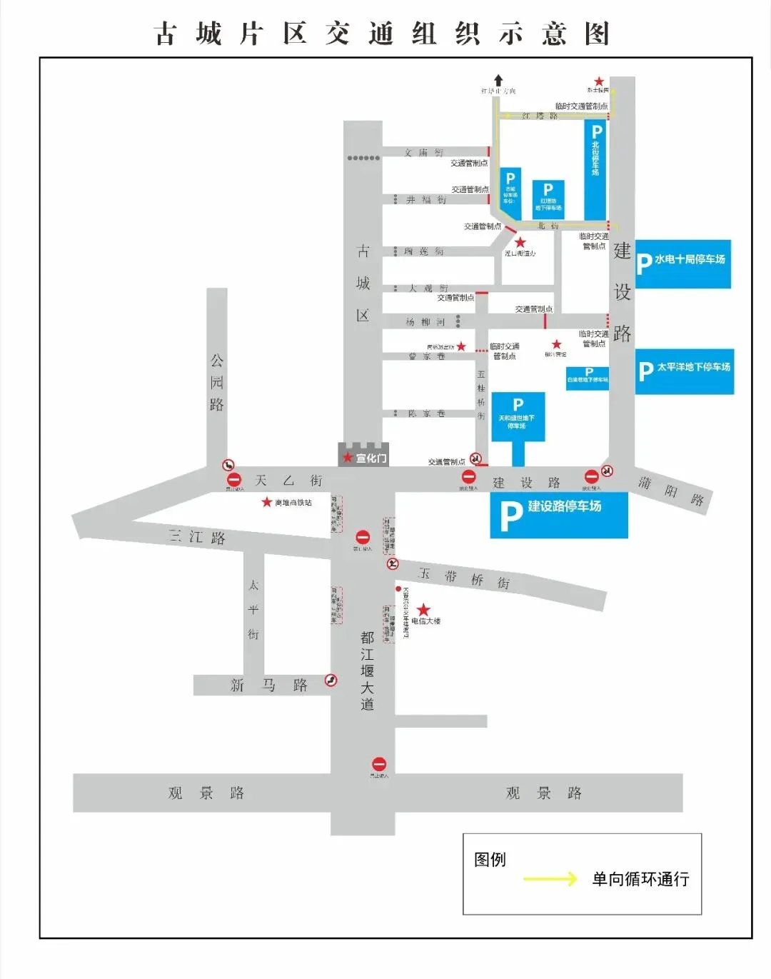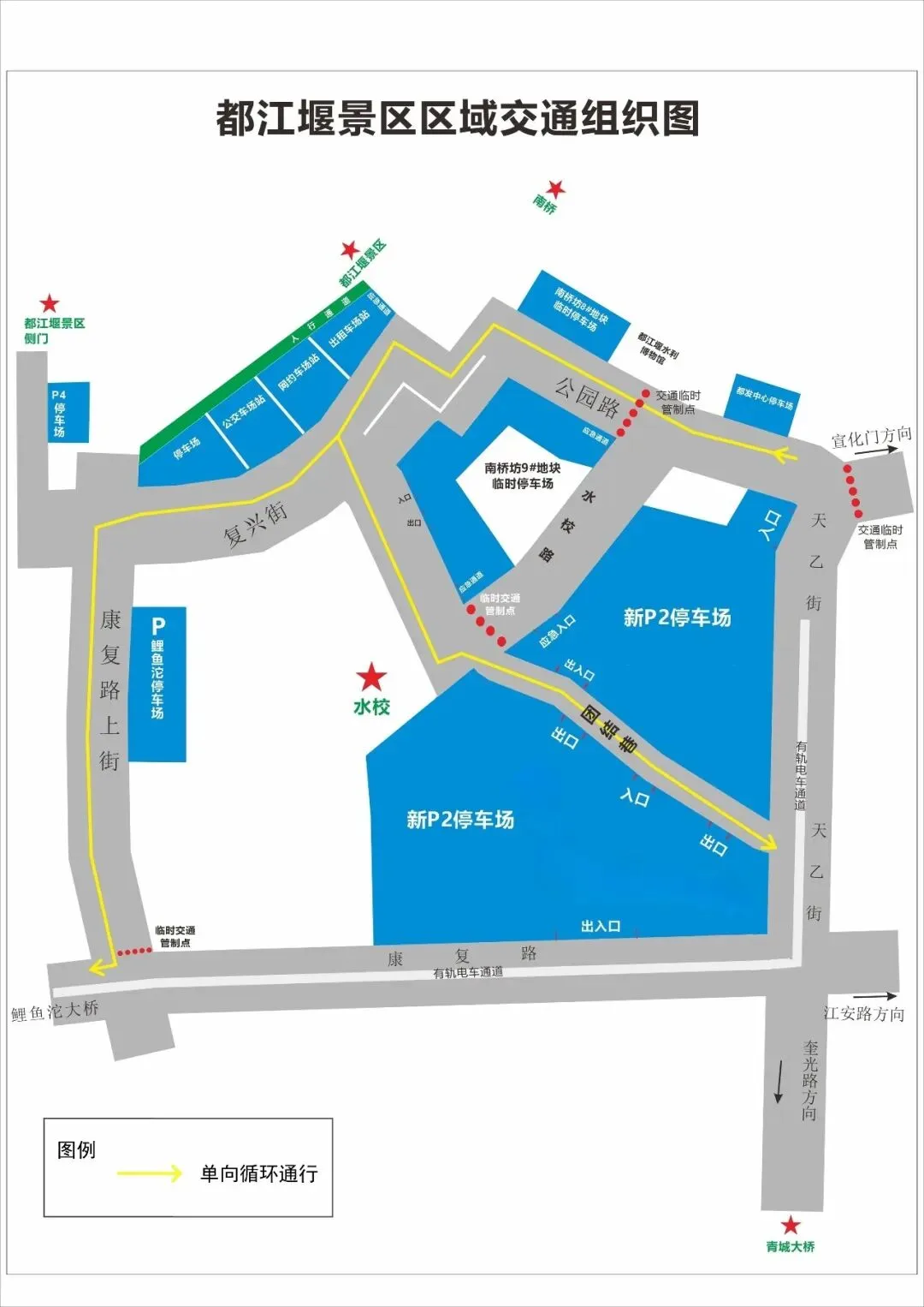 节日期间,公安交管部门将根据车辆通行情况对景区区域道路实施临时单循环交通组织,车辆由公园路驶入,经团结巷、水校路成勘院停车场、康复路上街驶出并通过鲤鱼沱大桥西、水果侠路口、鑫玉大道等道路进行交通转换。