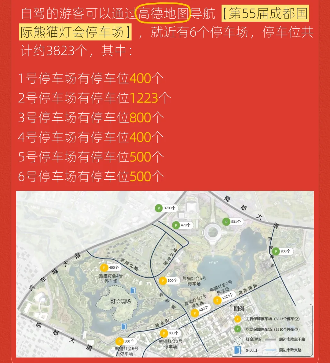 导航搜索“第55届成都国际熊猫灯会停车场”或“东安湖溪峰岛”。现场设有大型专用停车场及临时停车区域,车位充足,专人引导疏导。