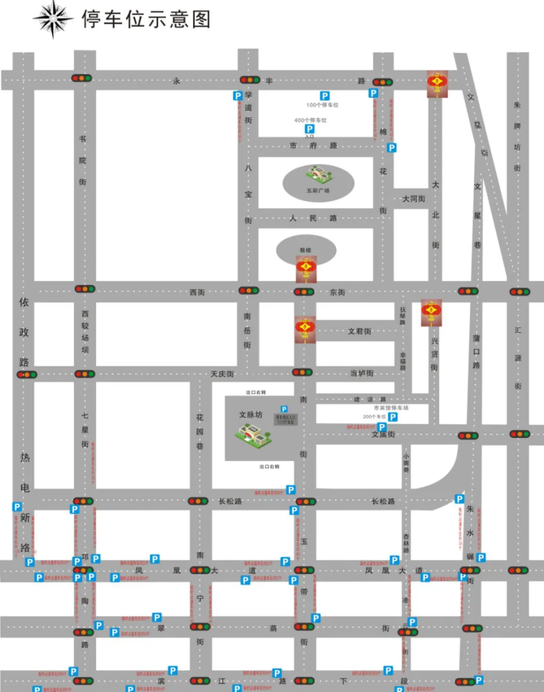 1、文脉坊、兴贤街区域文脉坊地下停车场、市宾馆停车场,同时在文庙街、七星街和长松路增设临时占道停车位。(详见停车位示意图)